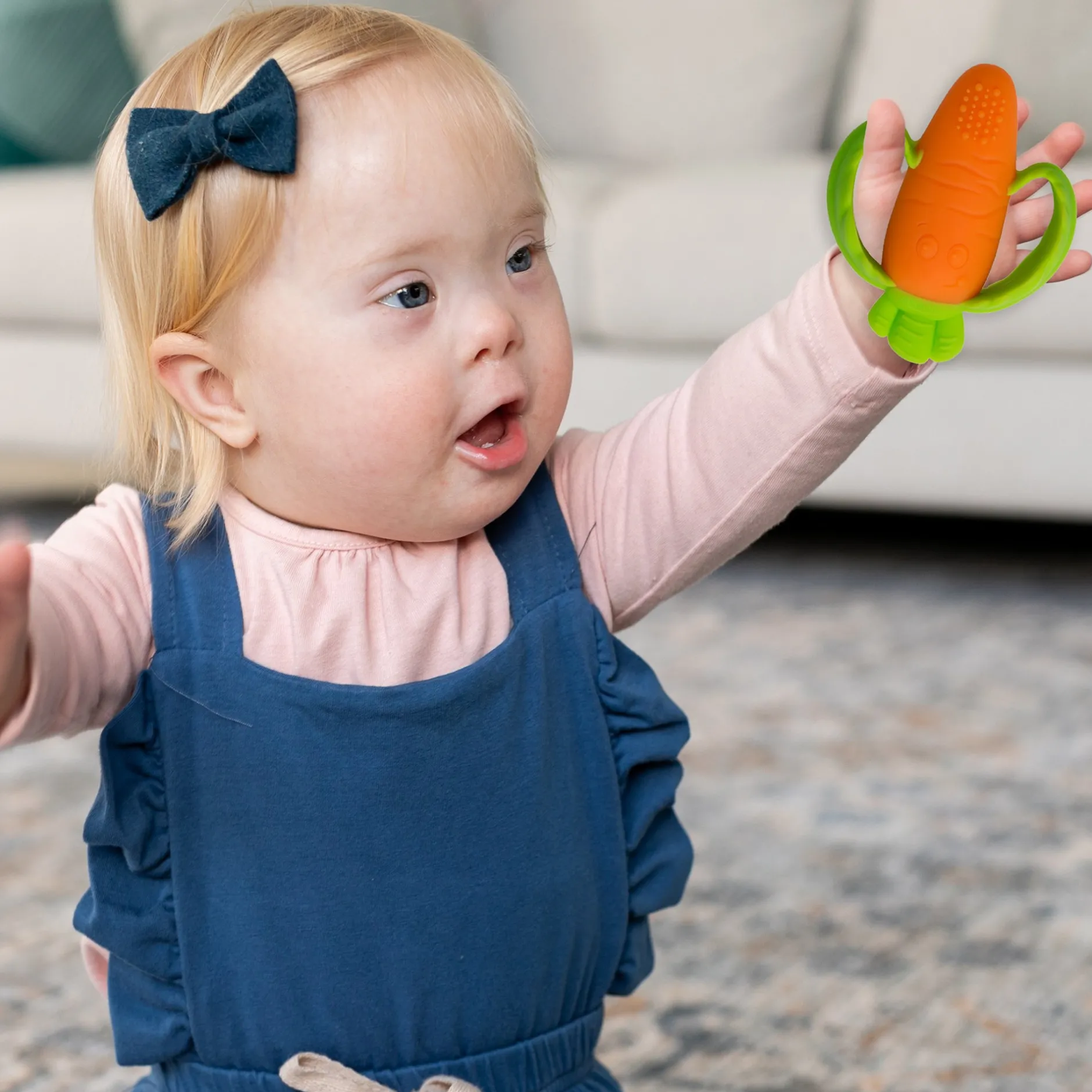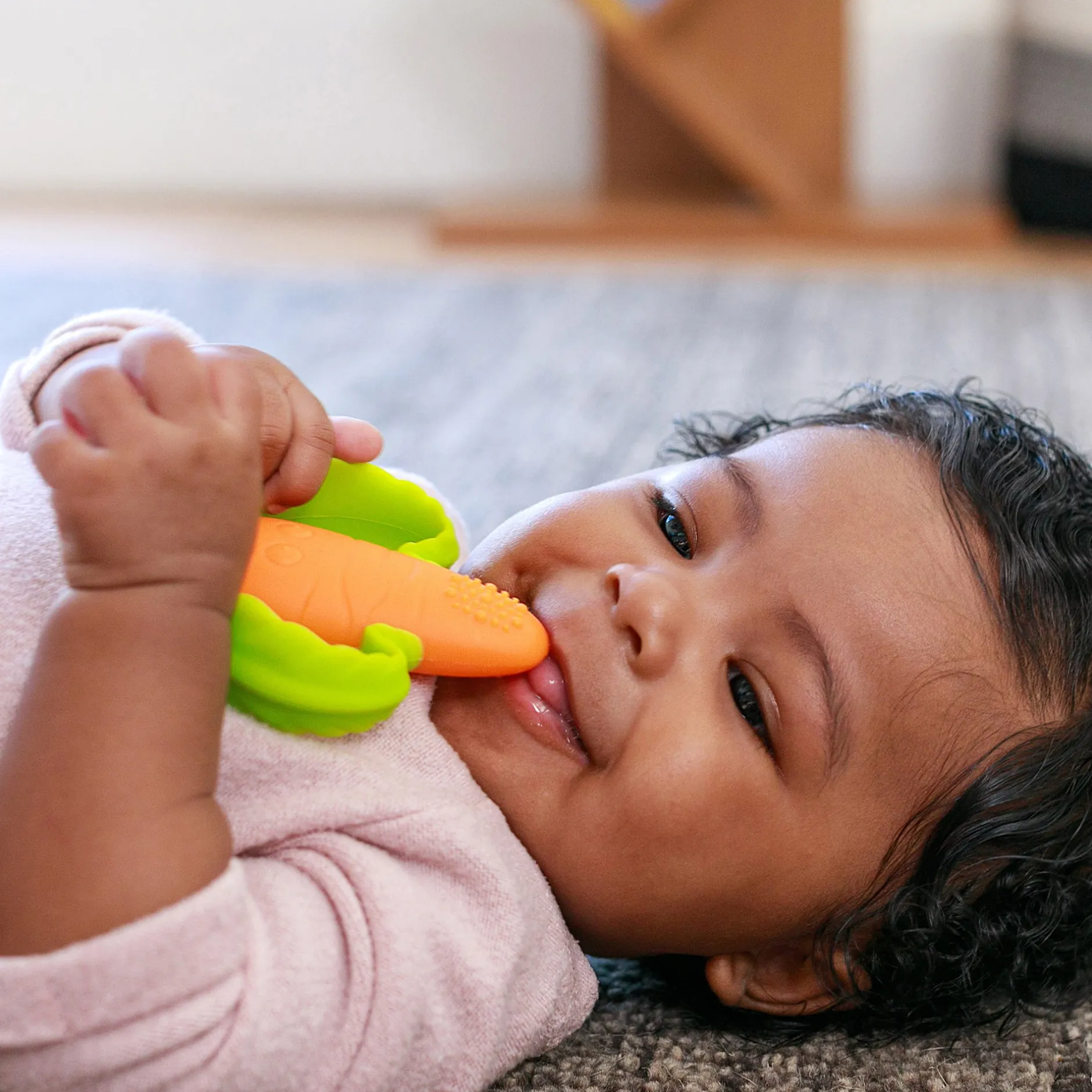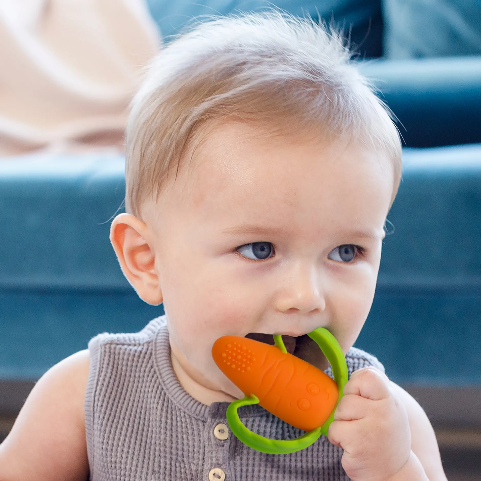 Ce petit anneau de dentition en forme de carotte, fabriqué en silicone souple, est idéal pour apaiser les douleurs liées à la poussée dentaire tout en stimulant les sens de bébé grâce à sa surface texturée.