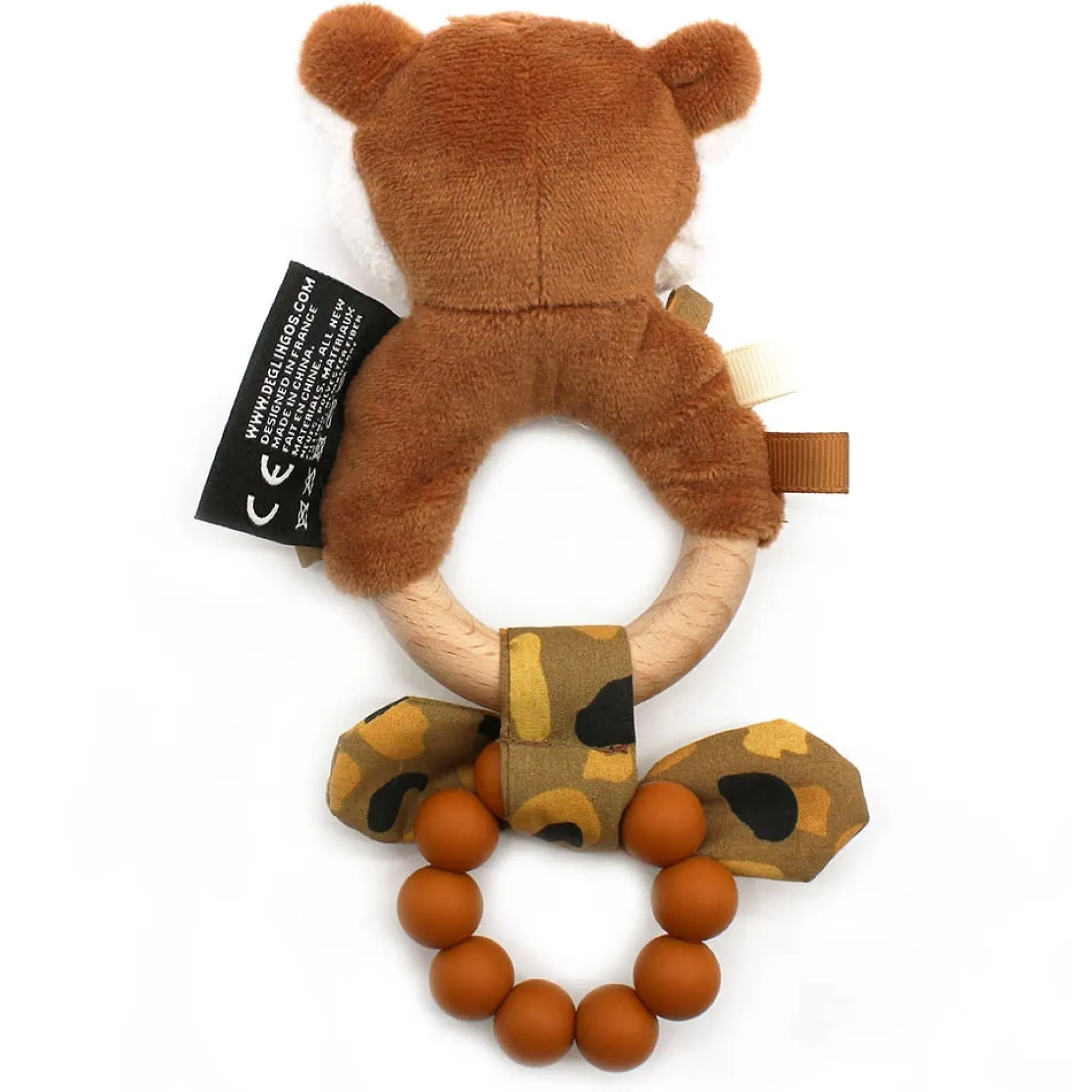 Il est également composé d’un anneau de billes en silicone marrons ultra pratiques pour soulager les poussées dentaires de bébé. A mordiller sans modération !