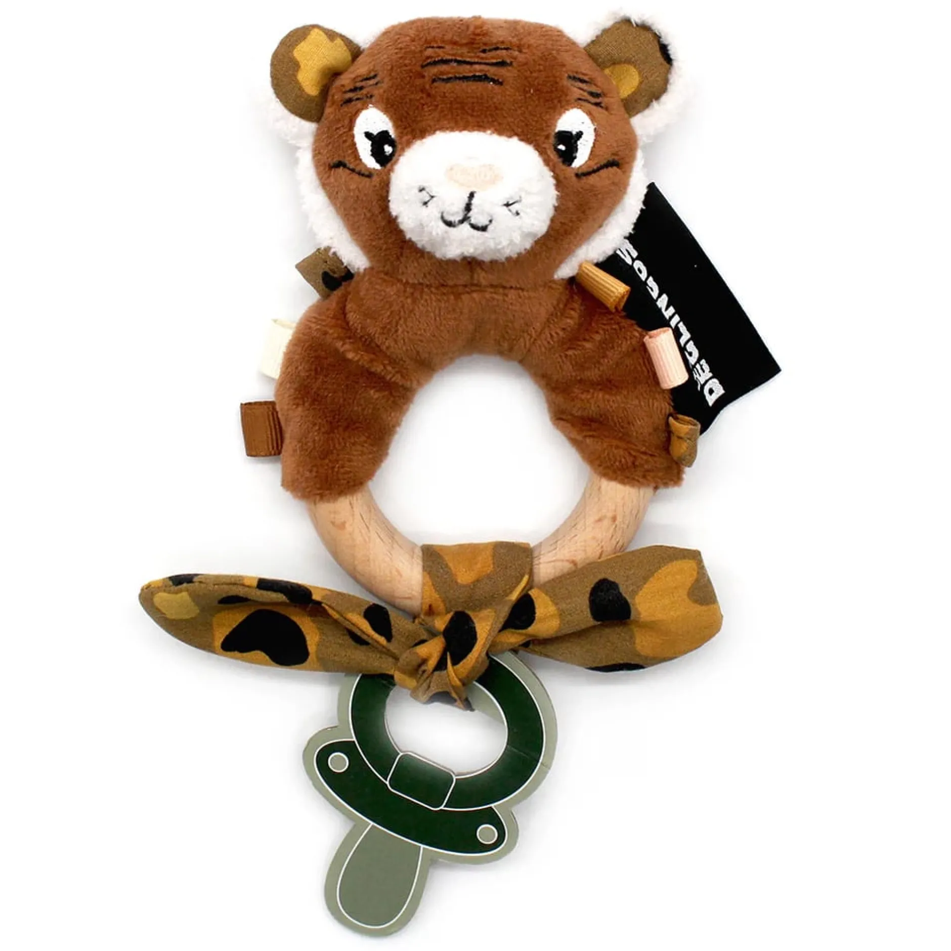 L’anneau de dentition est composé d’un anneau en bois pour la préhension de bébé, recouverte en partie avec une peluche toute douce à l’effigie de Speculos le tigre.