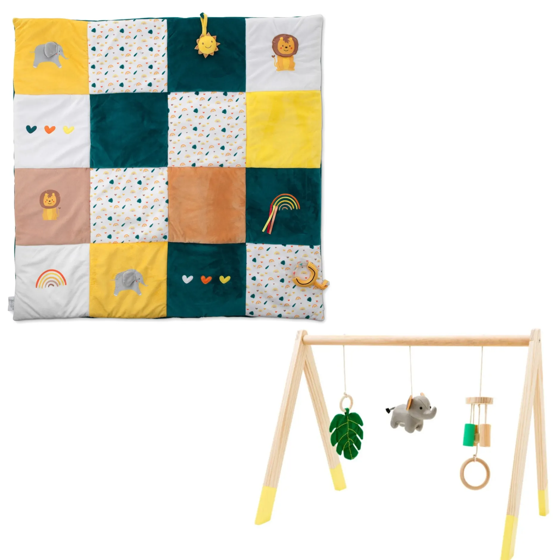 Pack contenant un tapis d’éveil XL, moelleux et confortable pour des heures de jeux et une arche d’éveil tout en bois, ultra-légère, au design épuré et rigolo !