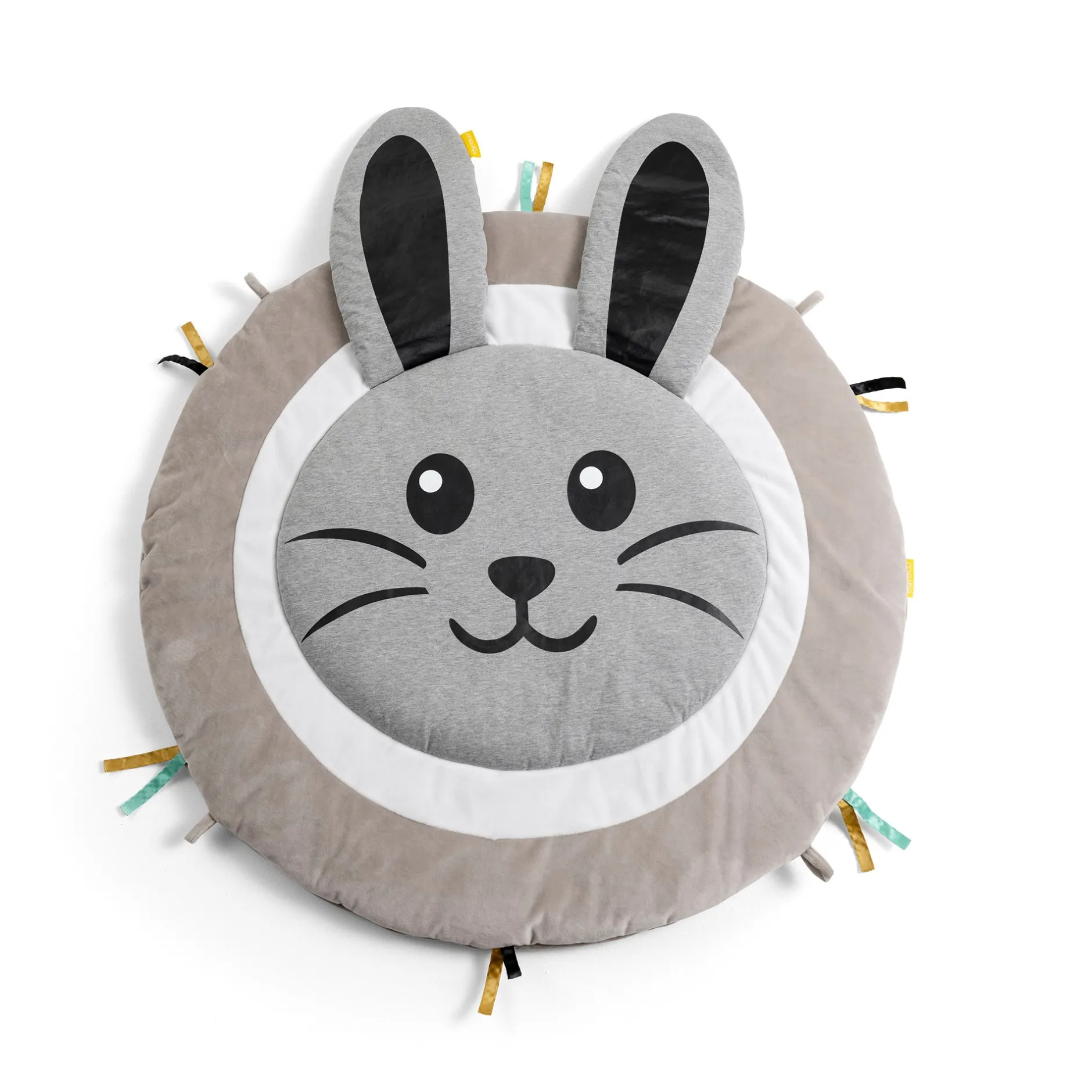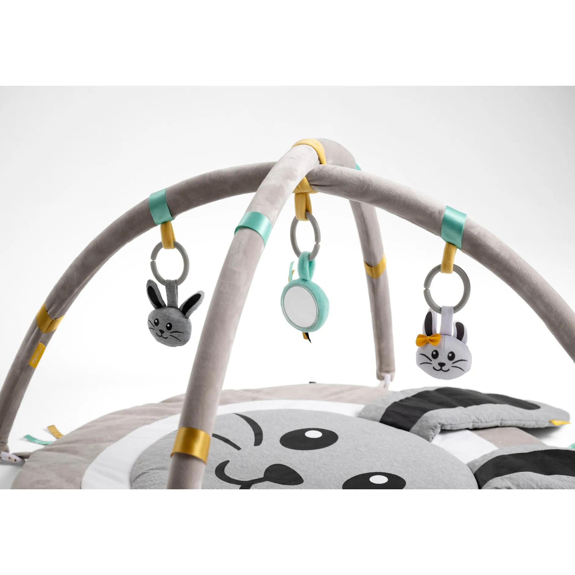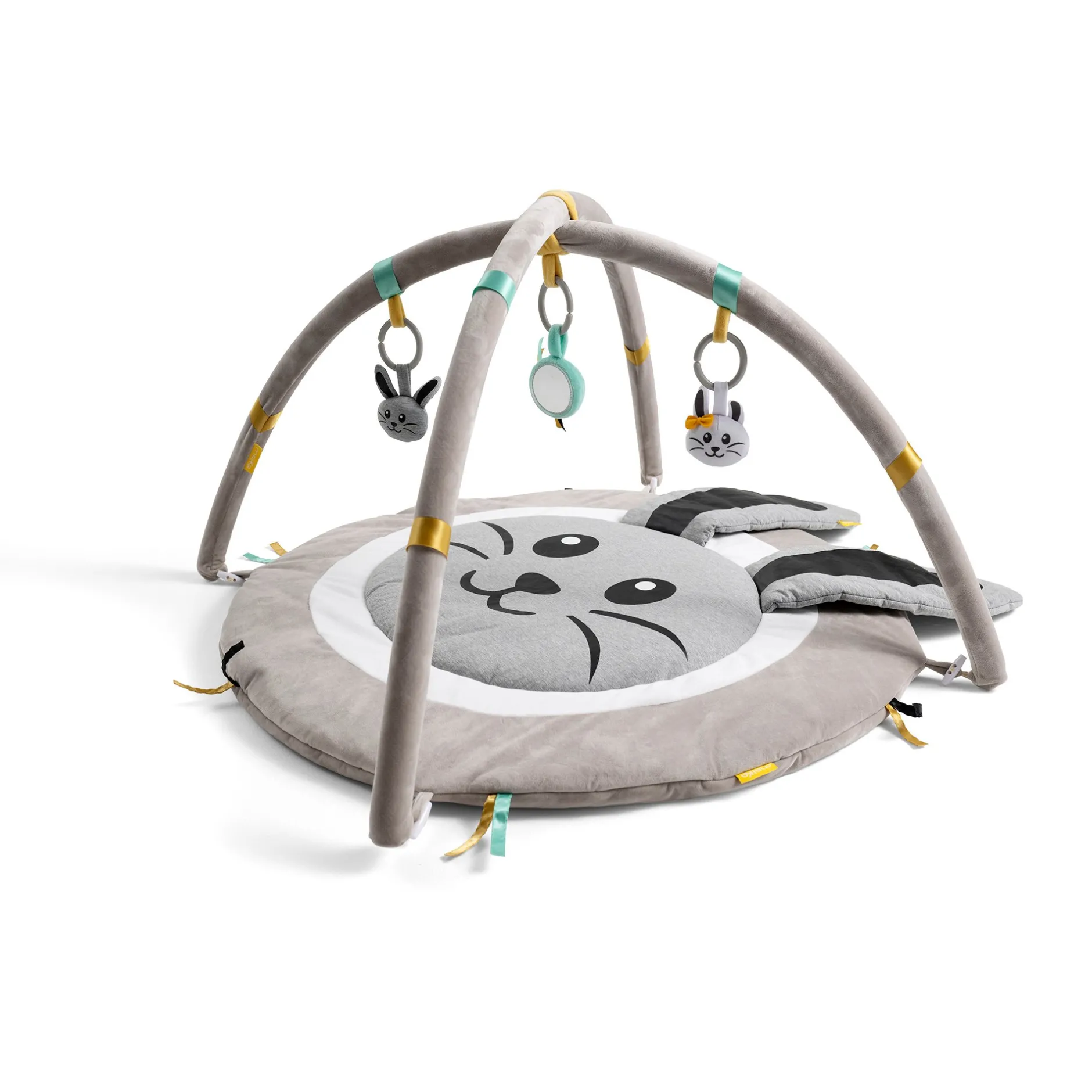 Les différents tissus (velours / jersey) sont doux et agréables pour un confort optimal ! Sur le dos, Bébé pourra découvrir les peluches lapins, le miroir ainsi que les rubans de couleurs enroulés sur les arches.Lorsque Bébé sera sur le ventre, il pourra s’amuser avec les oreilles du lapin « géant », toucher les différentes matières et tirer sur les rubans tout autour du tapis.