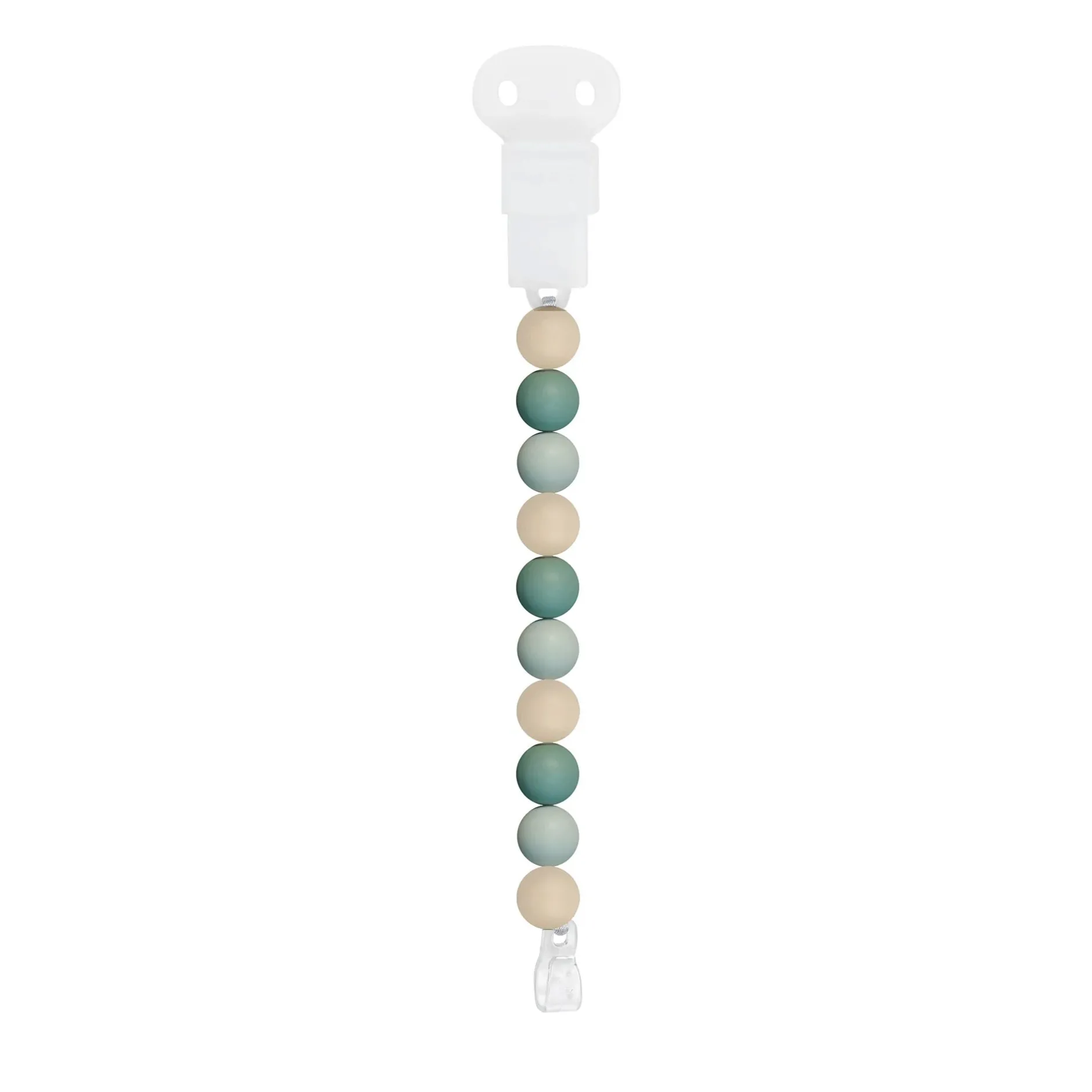 Attache-sucette souple avec clip flexible, adaptée à tous les modèles grâce à deux systèmes de fixation différents: crochet ou anneau Clip en plastique réglable pour l’attacher à une couverture ou à un vêtement, billes colorées à mordiller pour soulager la douleur de la première dent