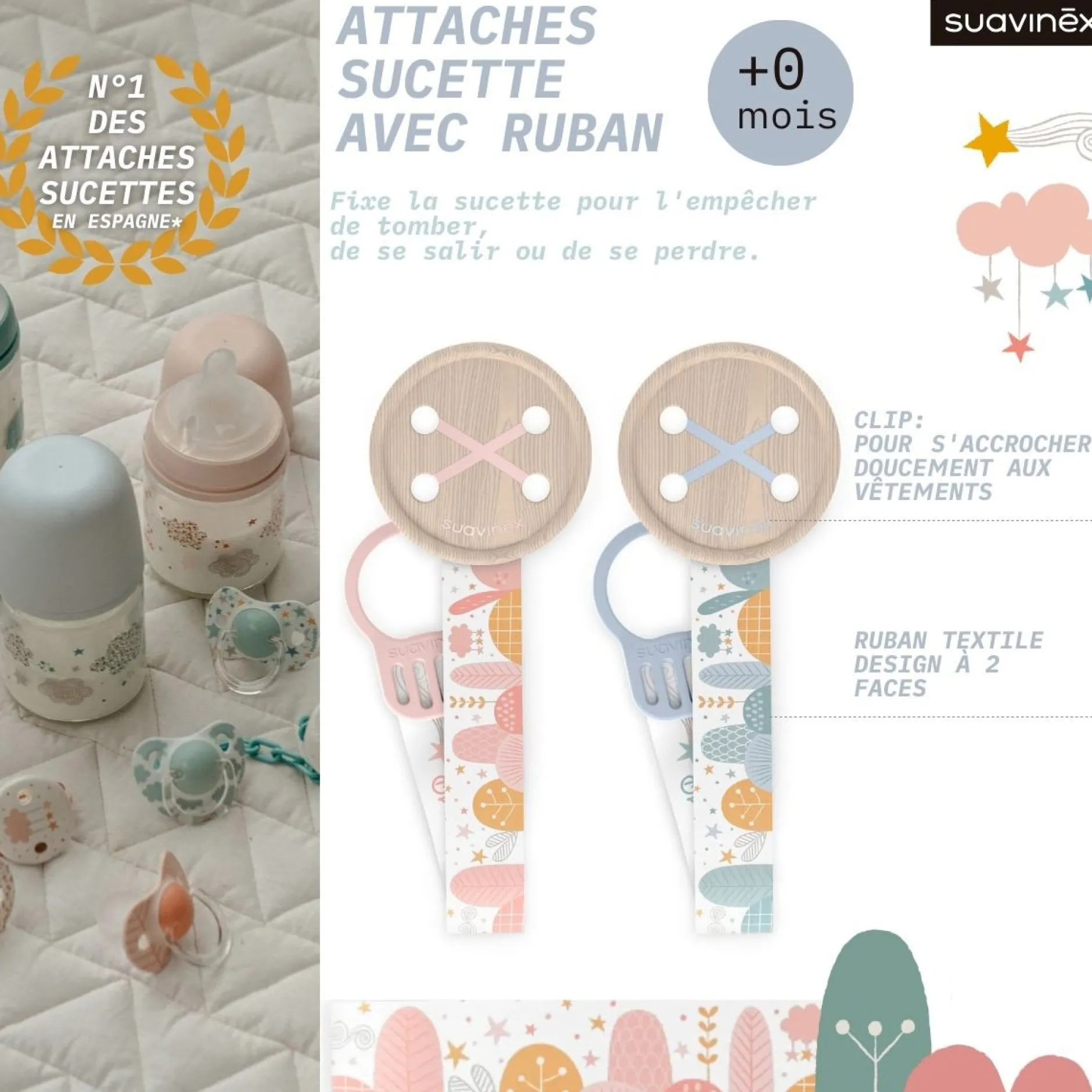 Attache sucette avec ruban Fixe la sucette pour l’empêcher de tomber, de se salir ou de se perdre.