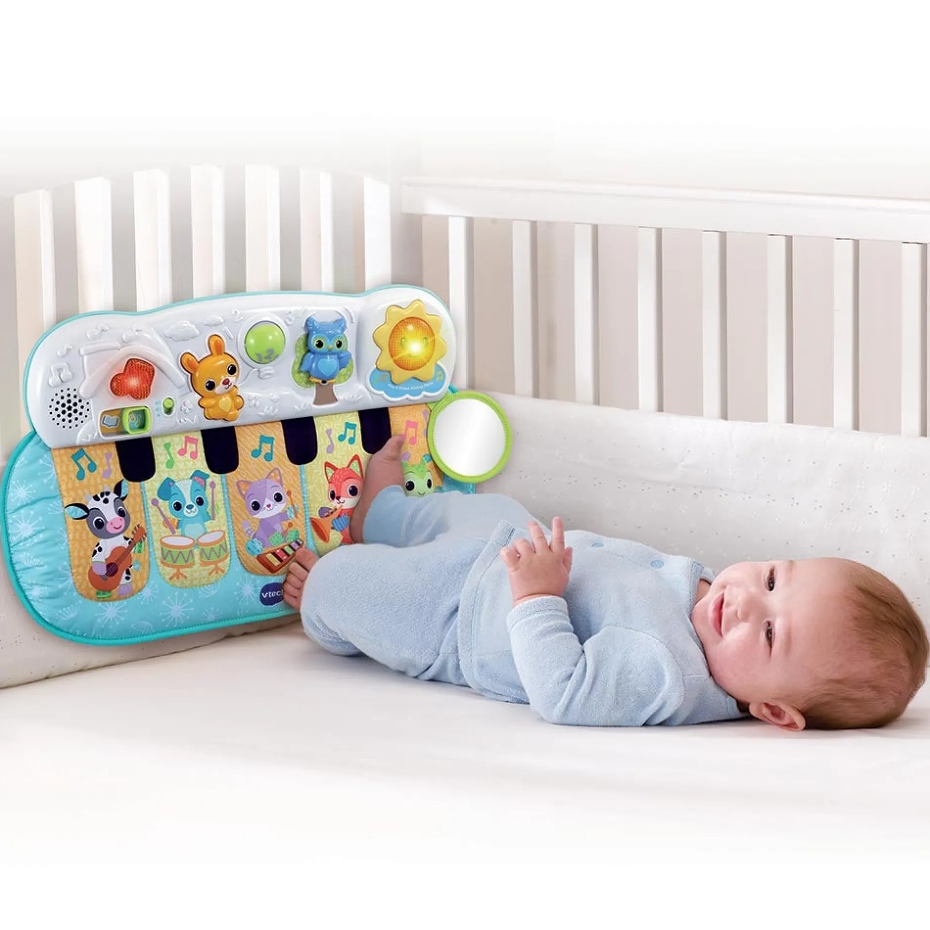 Avec le Tap Tap piano des Baby loulous, Bébé découvre les animaux et leur cri, les instruments et notes de musique. En remuant simplement ses pieds, il déclenche des phrases, des mélodies et des sons amusants. En grandissant, il peut jouer du piano et manipuler les différentes touches ou boutons avec les mains. Quand vient l’heure de dormir, de douces mélodies accompagnent votre tout-petit dans son sommeil. Le piano peut se poser au sol et s’attacher aux barreaux du lit ou du parc.
