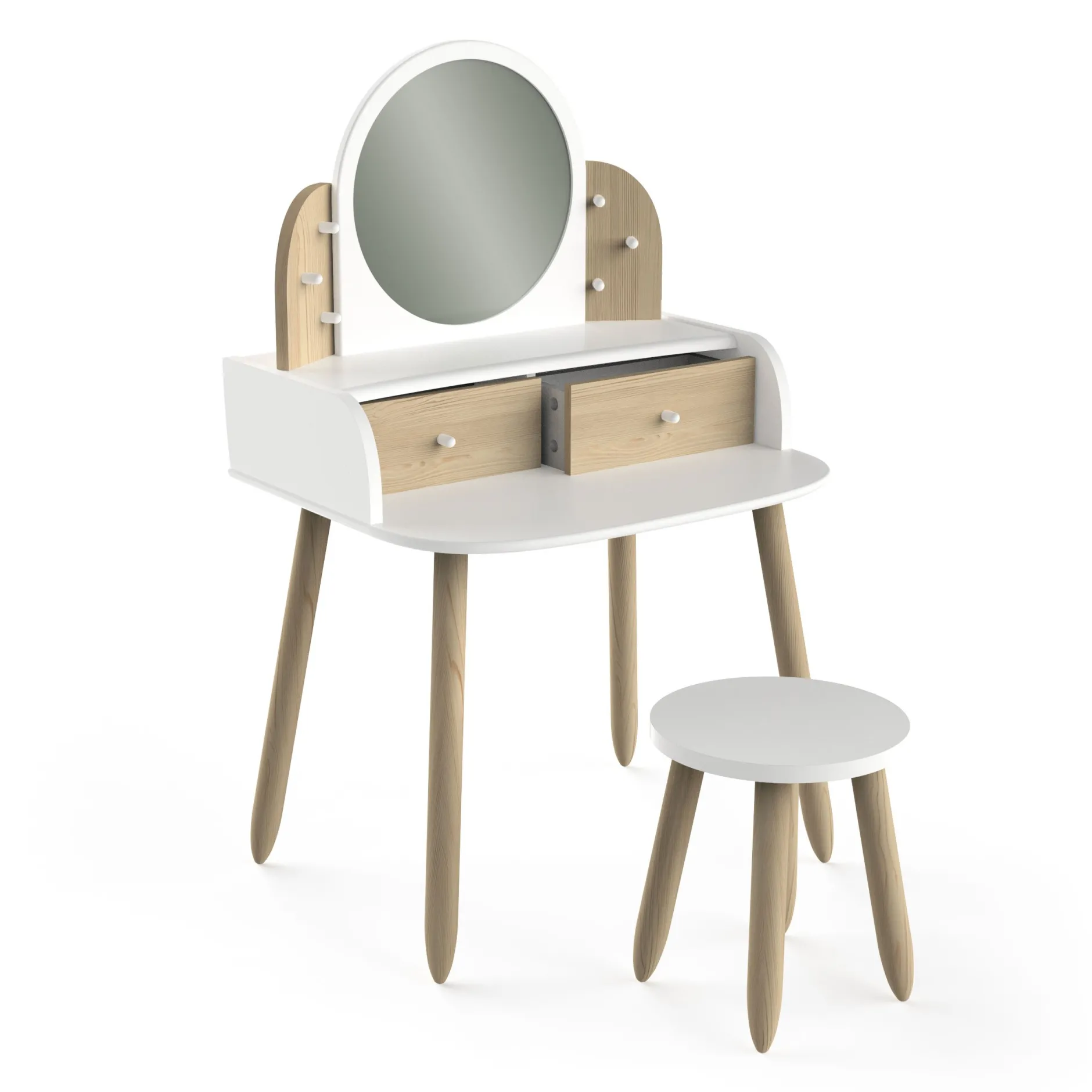 Une coiffeuse avec son petit tabouret, composée d’un miroir, d’une tablette et de 2 tiroirs en bois naturel & blanc.