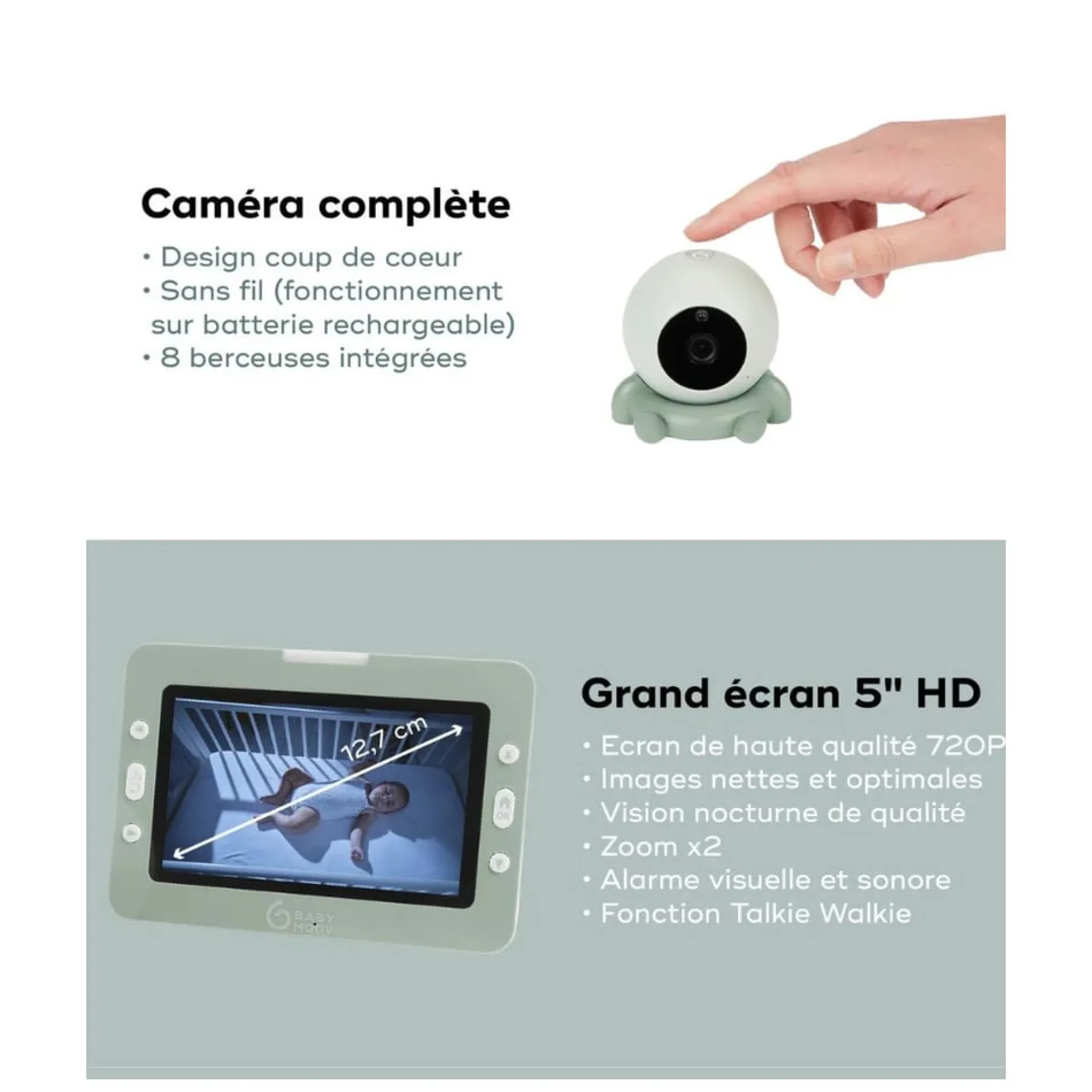 - Unité Bébé : batterie lithium rechargeable (câble USB-C inclus)