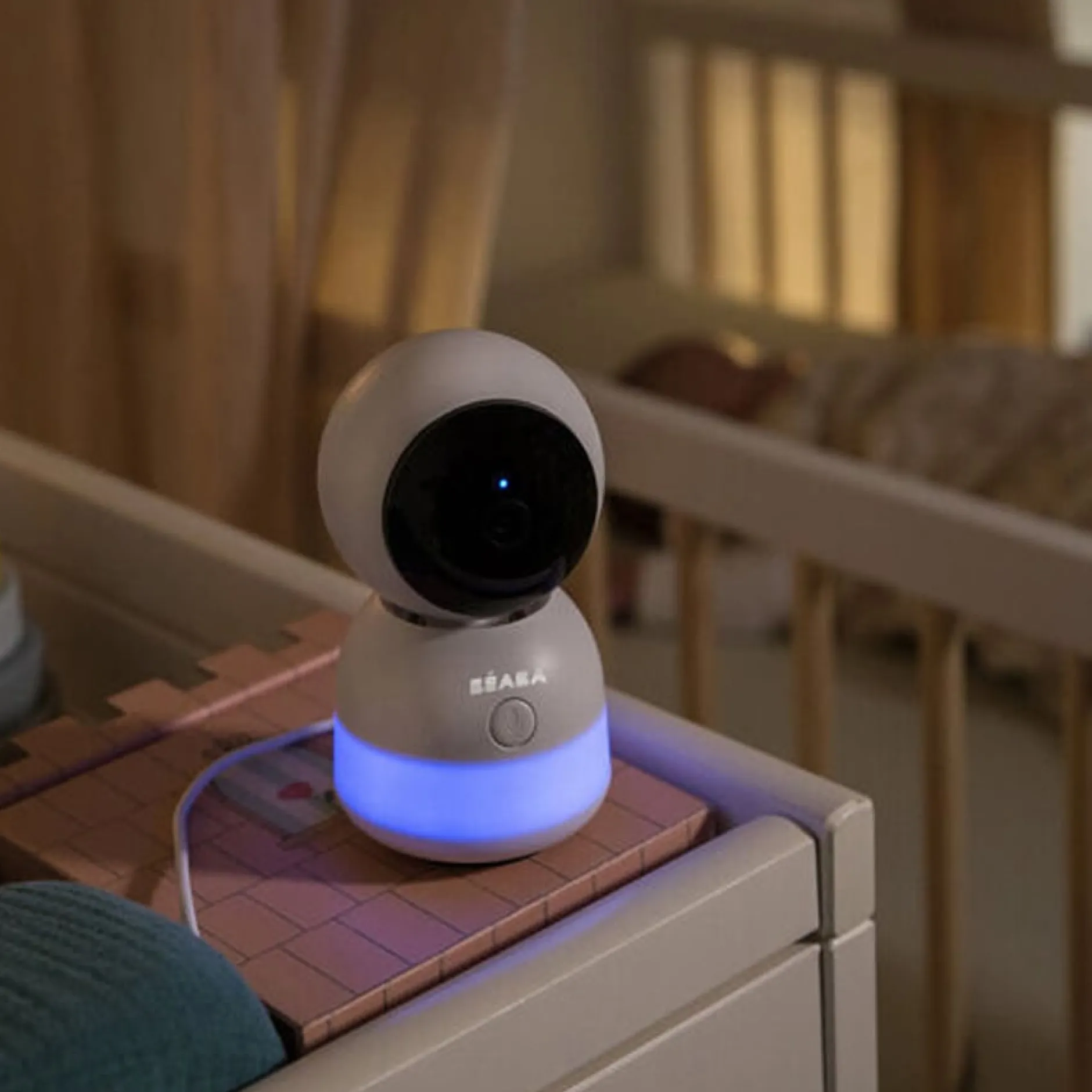 Écoute bébé vidéo connecté Béaba Zen Night Light, avec fonction veilleuse, caméra 360°, et appli dédiée pour surveiller bébé depuis son téléphone.