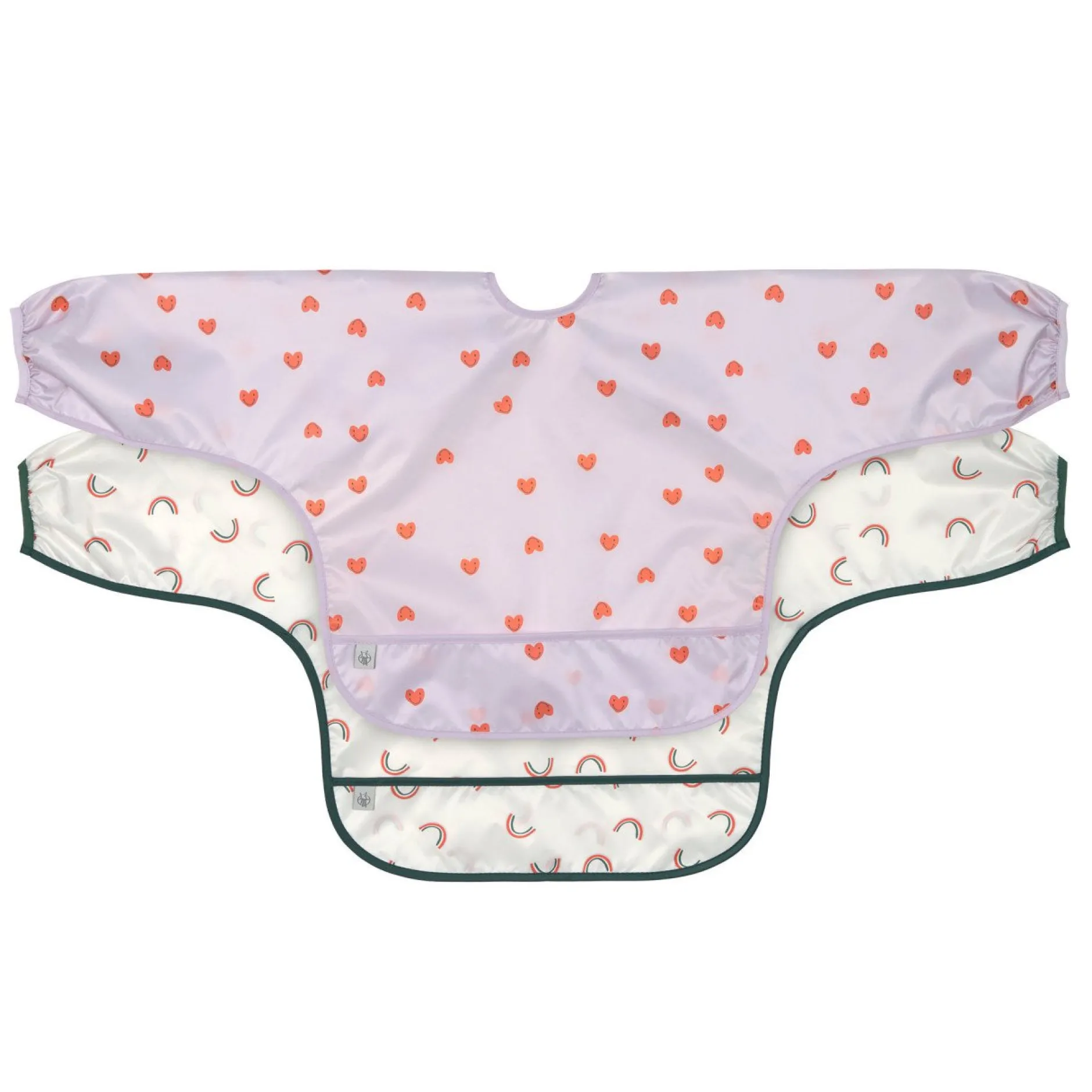 Les bavoirs sont en matière imperméable, ils sont donc parfaits pour les repas, mais aussi pour colorier ou bricoler, à la maison ou à la crèche.
