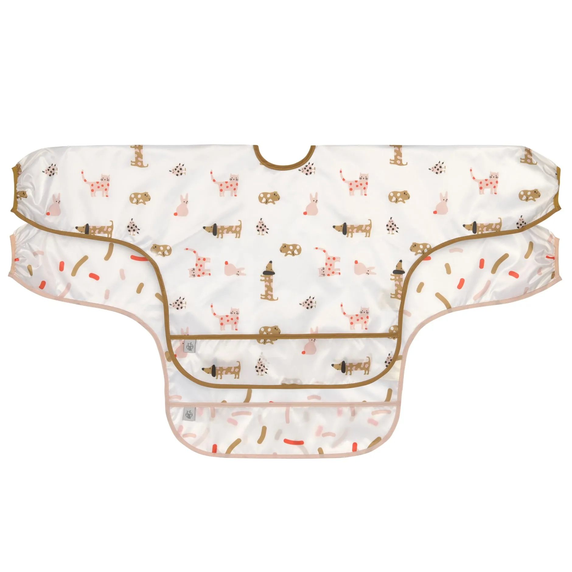 Les petits peuvent donc s’adonner librement à des activités créatrices , ou savourer leurs repas, sans craindre de se salir, car leurs vêtements restent propres et secs, grâce aussi à la poche ramasse-miettes. Pour les petits de 6 à 24 mois.