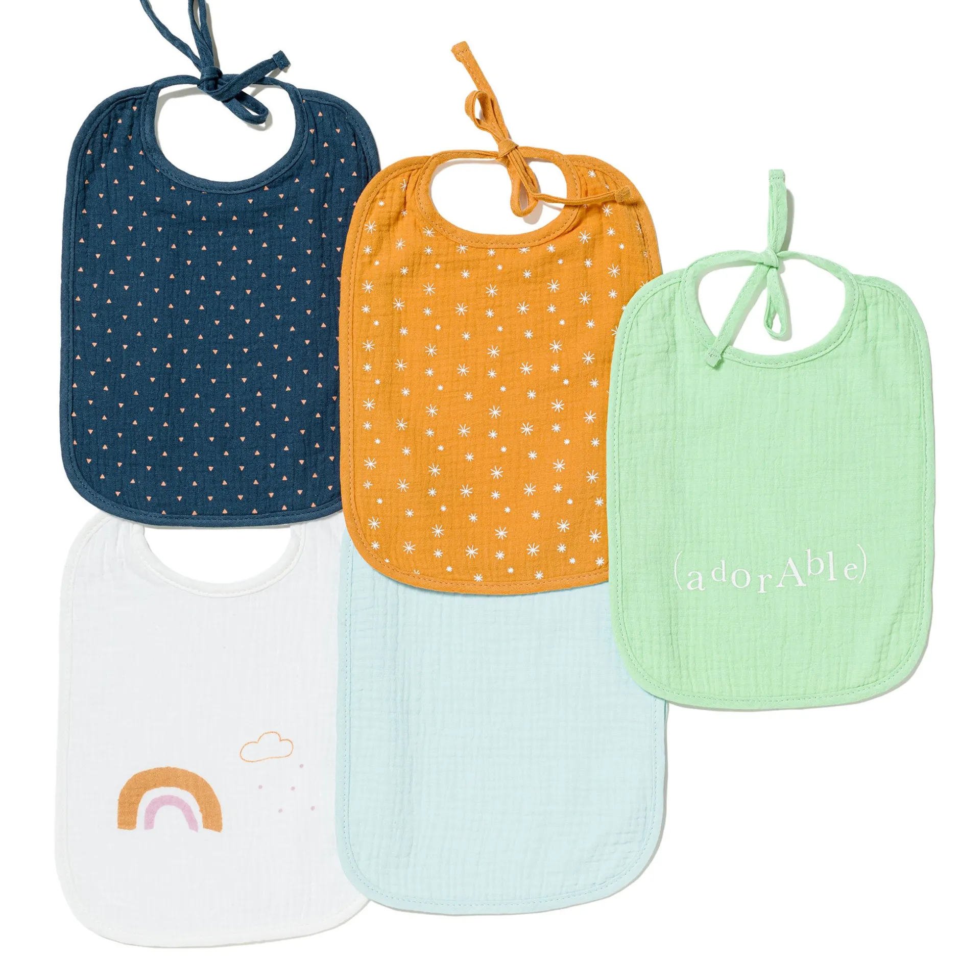 Lot de 5 bavoirs 2ème âge MAIKA en mousseline de gaze légèrement gaufrée et doublure éponge au dos : 1 en coloris écru à motifs arc-en-ciel, 1 en vert d’eau marqué « adorable », 1 en jaune gold avec motifs « étoiles », 1 en bleu ciel uni , 1 en bleu canard avec triangles. Ouverture fonctionnelle par des liens. Utiles à l’heure des repas, ils protègeront les vêtements de bébé et contribueront à sa propreté. Parfaits accessoires à offrir ou se faire offrir tellement pratiques tout en étant mode et tendance.
