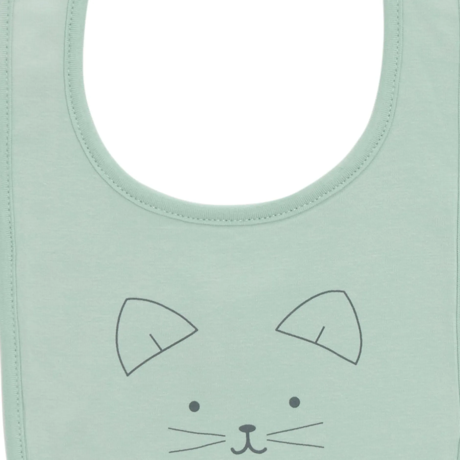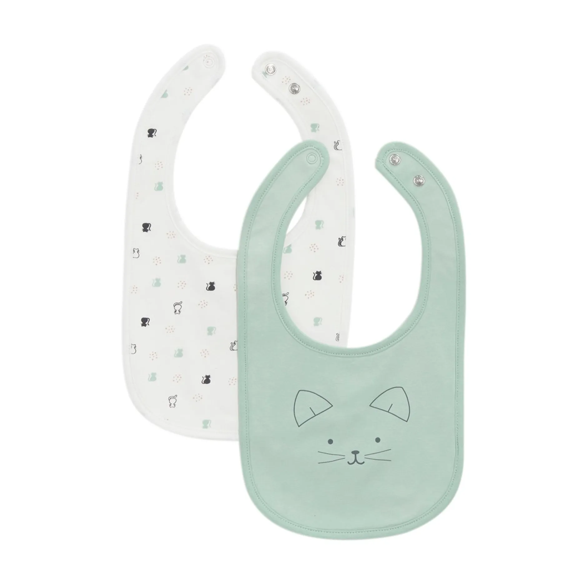Lot de 2 bavoirs P’tit Bisou : 1 en jersey écru avec imprimé « petits chats » et 1 en jersey vert sauge avec impression de petite tête de chat qui confère un côté très affectif.