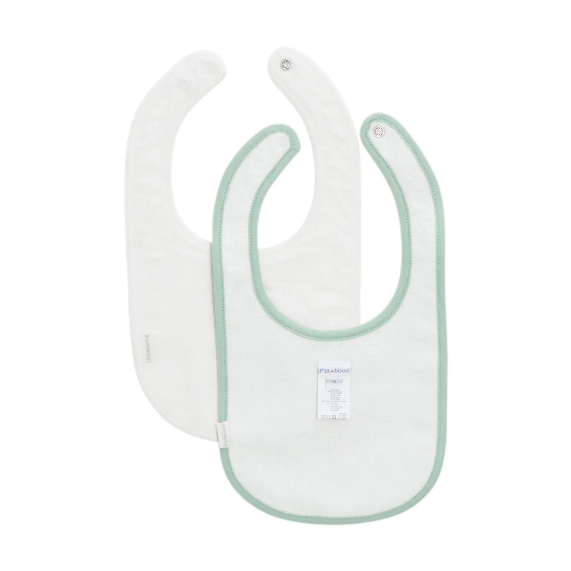 Tous deux sont et doublés d’éponge pour mieux absorber liquides ou aliments. Ouverture par patte réglable par des pressions pour bien s’ajuster autour du cou de bébé.