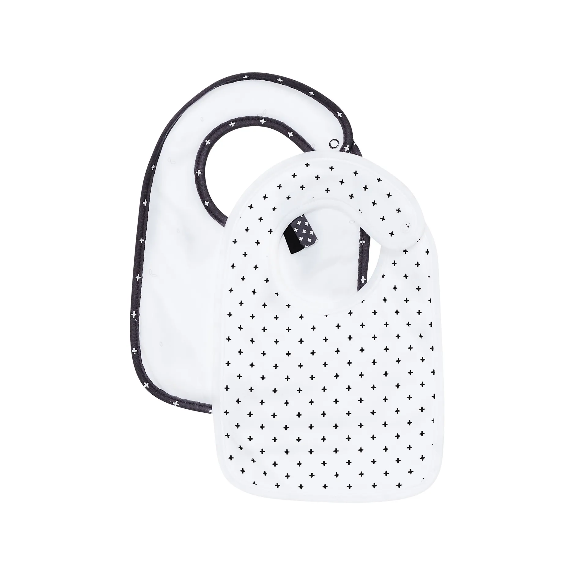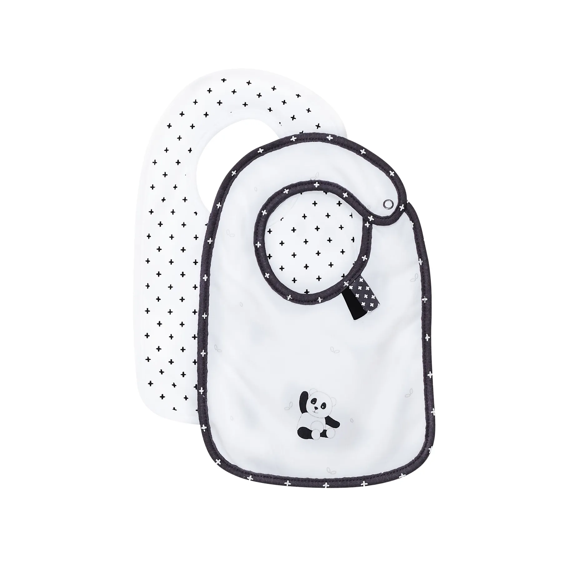 Pour les premiers repas de bébé, Sauthon a décliné deux bavoirs en jersey: un bavoir blanc en all-over avec biais blanc uni et un bavoir blanc avec biais constraté gris foncé et motif placé d’un chao chao faisant coucou .
