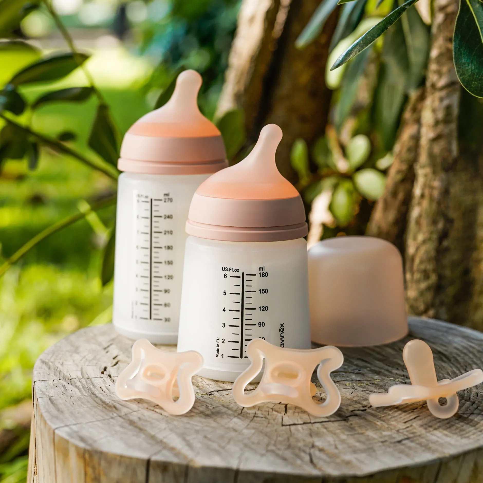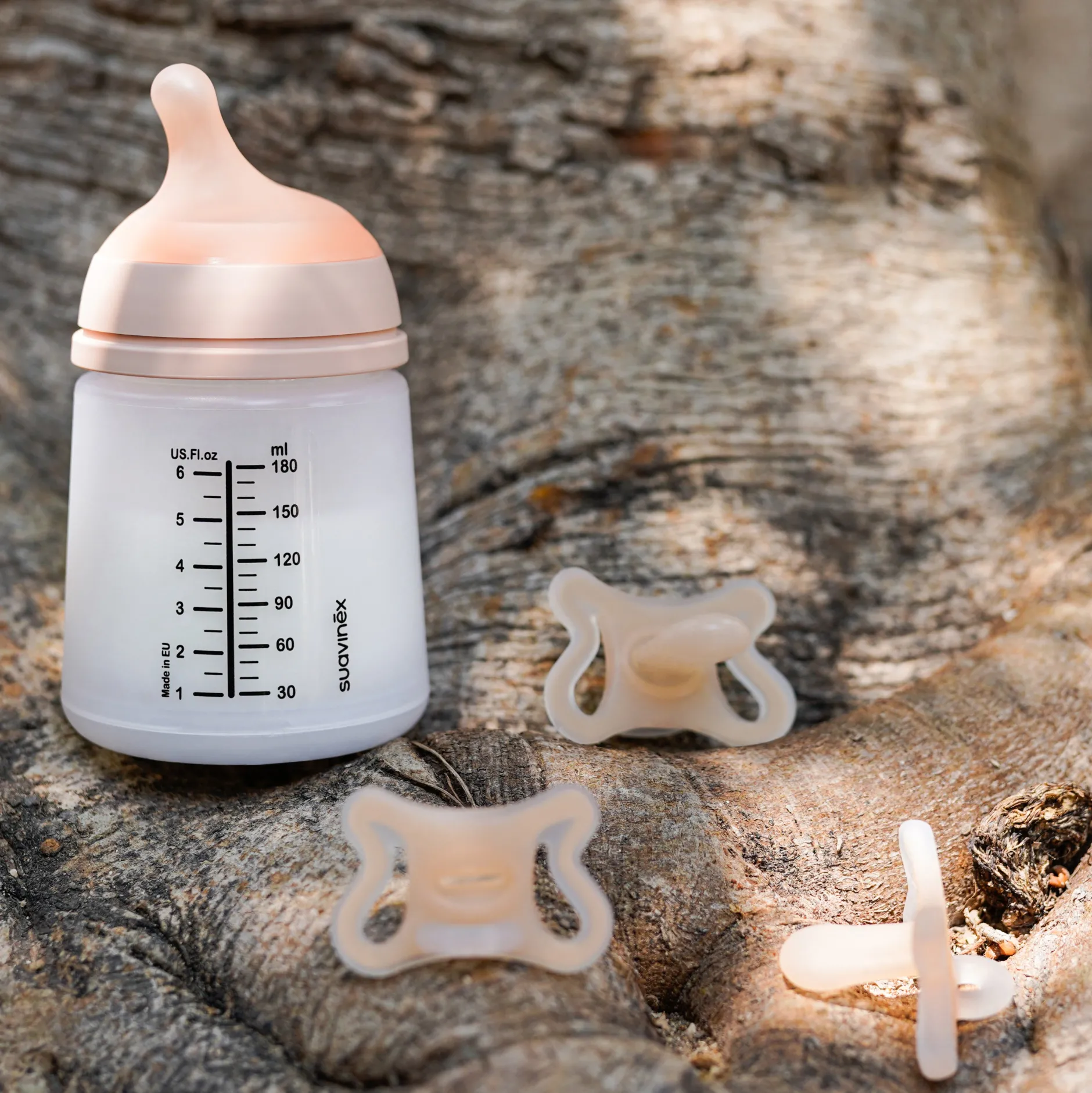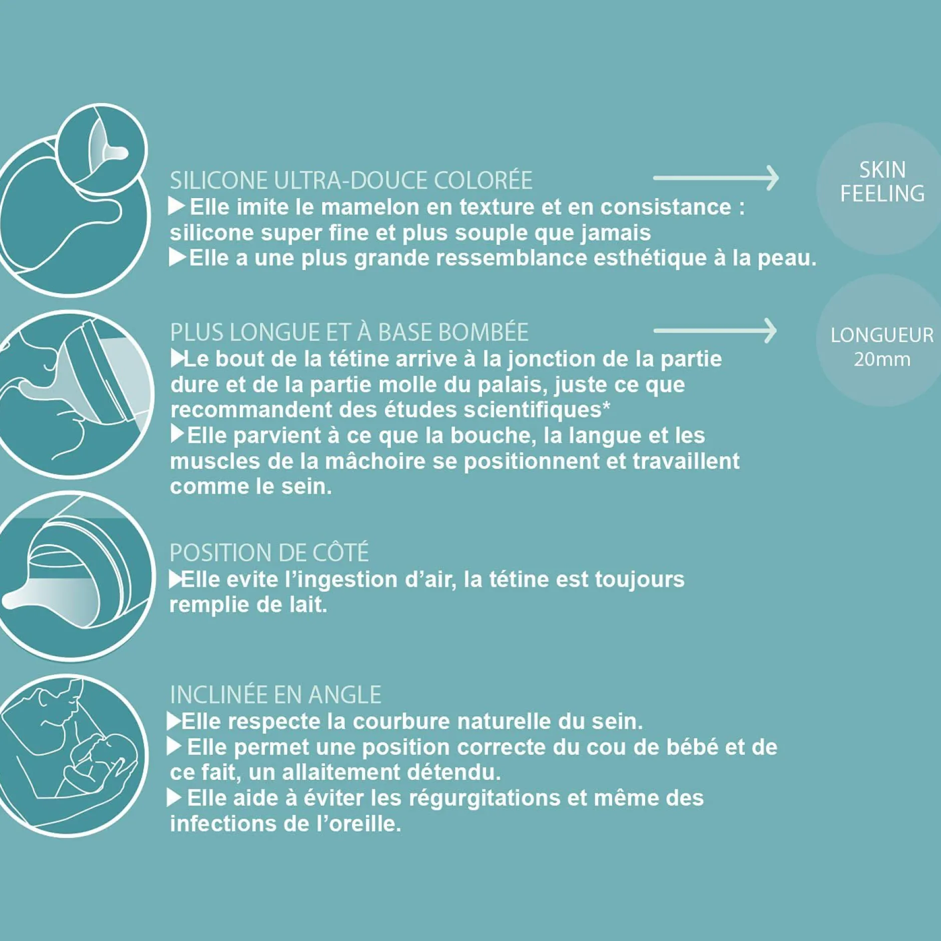 La tétine est révolutionnaire, conçue sur des études scientifiques, elle ressemble au plus près au sein maternel. Sa couleur chair, sa texture douce, son inclinaison et sa longueur permettent de minimiser la confusion sein-biberon.
