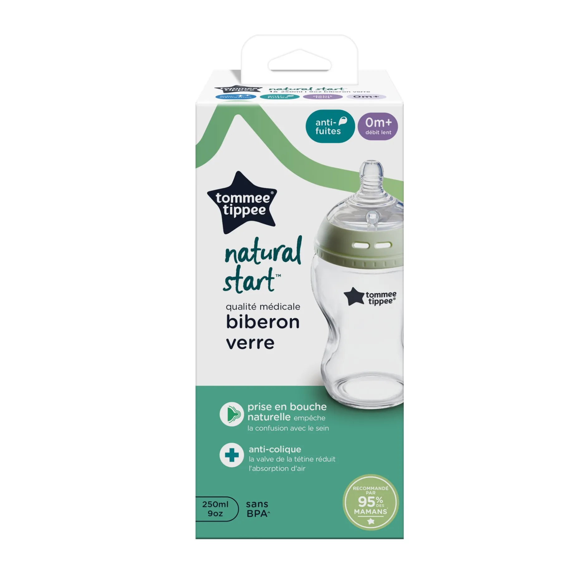 Tommee Tippee Biberons, Biberon en verre Anti-colique Natural Start, 250ml, tétine imitant la forme du sein pour prise en bouche naturelle,
