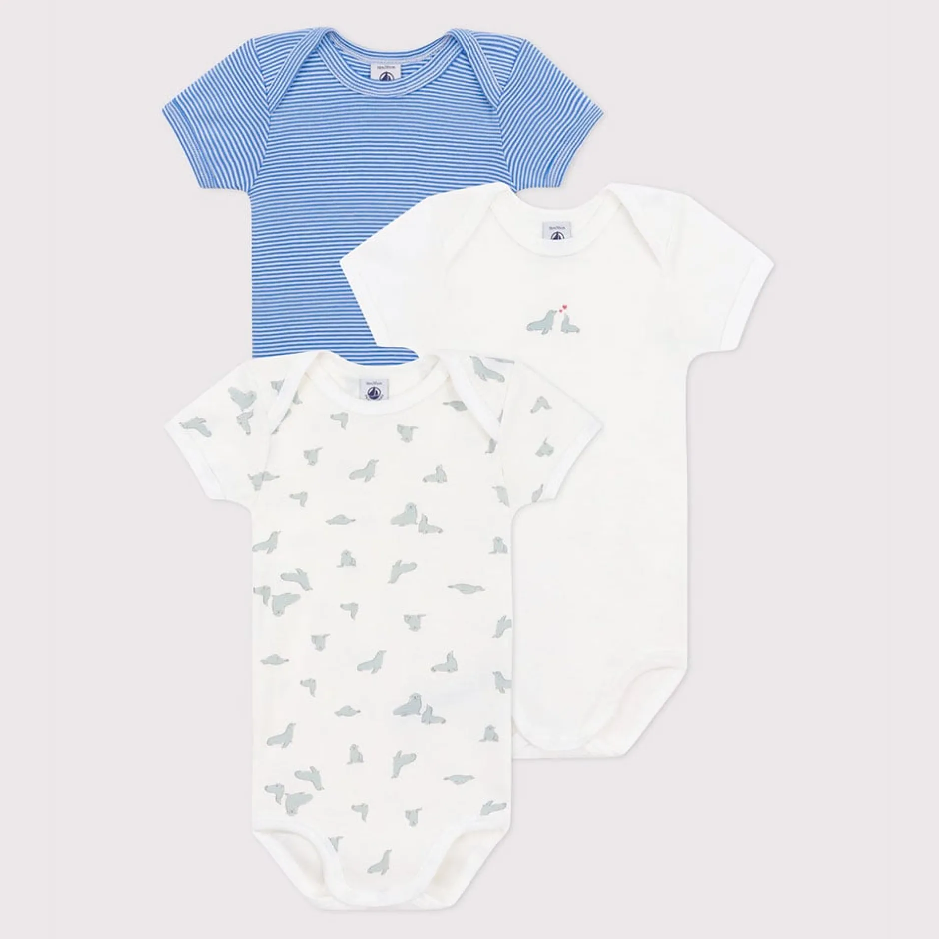 Lot de 3 bodies mixte manches courtes en côte 1X1, une matière extensible et confortable. Quand bébé grandit, le body à encolure américaine prend le relai du body croisé. Grâce à son ouverture large, il est facile d’habiller bébé par la tête sans le serrer ! Pratique grâce à l’encolure américaine et aux boutons-pression à l’entrejambe. Ce lot comprend un body imprimé phoques, un body uni et un body à rayures milleraies bleu.