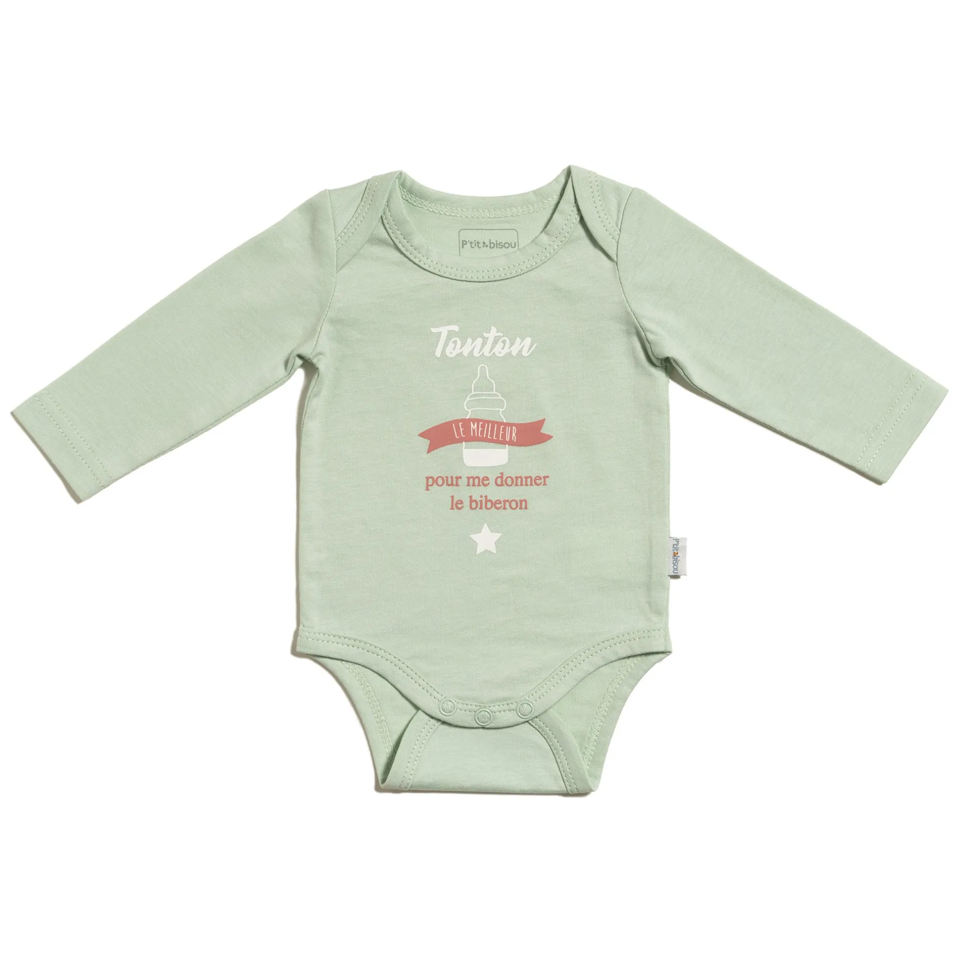 Body manches longues P’tit Bisou en jersey en coloris vert sauge . Il a une emmanchure américaine et ouverture entrejambes par pression en ton sur ton .