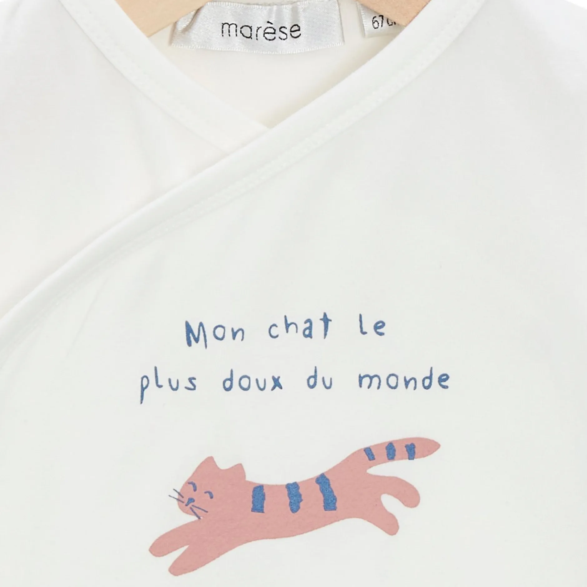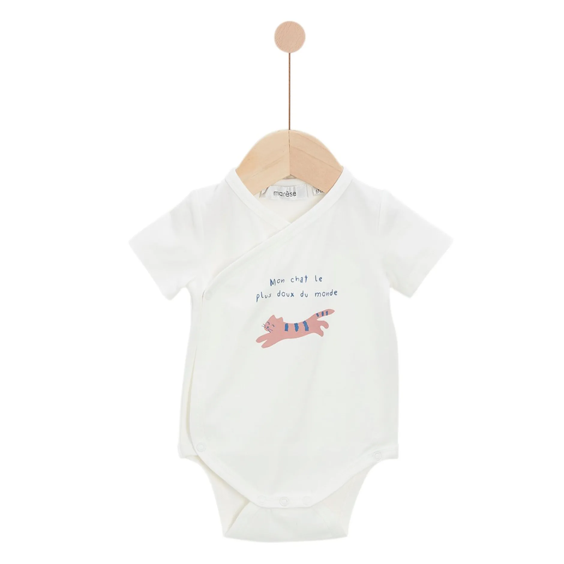 Body manches courtes Marèse en jersey écru. Très belle animation ludique devant représentant un petit chat qui court avec un texte : » Mon chat le plus doux du monde ». Très fonctionnel avec ouverture devant et entrejambes par pressions pour davantage de fonctionnalité. Très beau produit qui s’associe avec toutes les silhouettes et qui en plein été peut se porter tout seul. Lavage conseillé à 30°C.