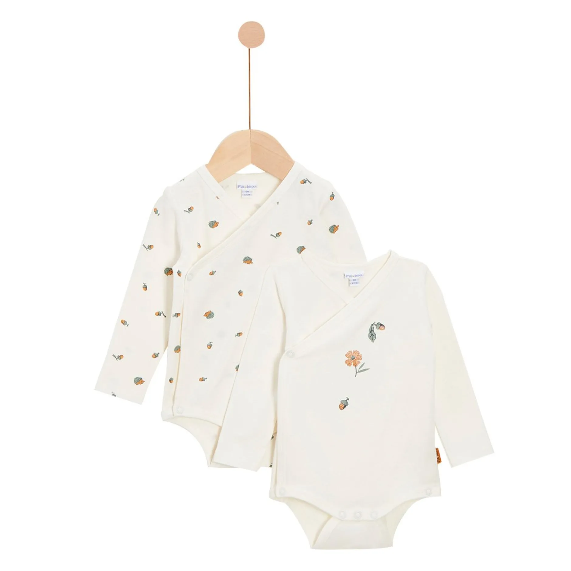 Lot de 2 Bodies manches longues P’tit Bisou : 1 en jersey sur fond de l’imprimé minimaliste « feuillage automnal » sur fond écru et un autre gris anthracite . Absolument fonctionnels avec leurs ouvertures devant et entrejambes par pressions pour plus de fonctionnalité. Très belle animation sur le devant du gris qui représente un petit hérisson en ballade dans la forêt. Ce lot très craquant et pratique peut se porter aussi bien en pièce de dessous que dessus ! Il peut se porter de jour comme de nuit ! La pièce parfaite à avoir dans son armoire ! Lavage conseillé à 30°c.