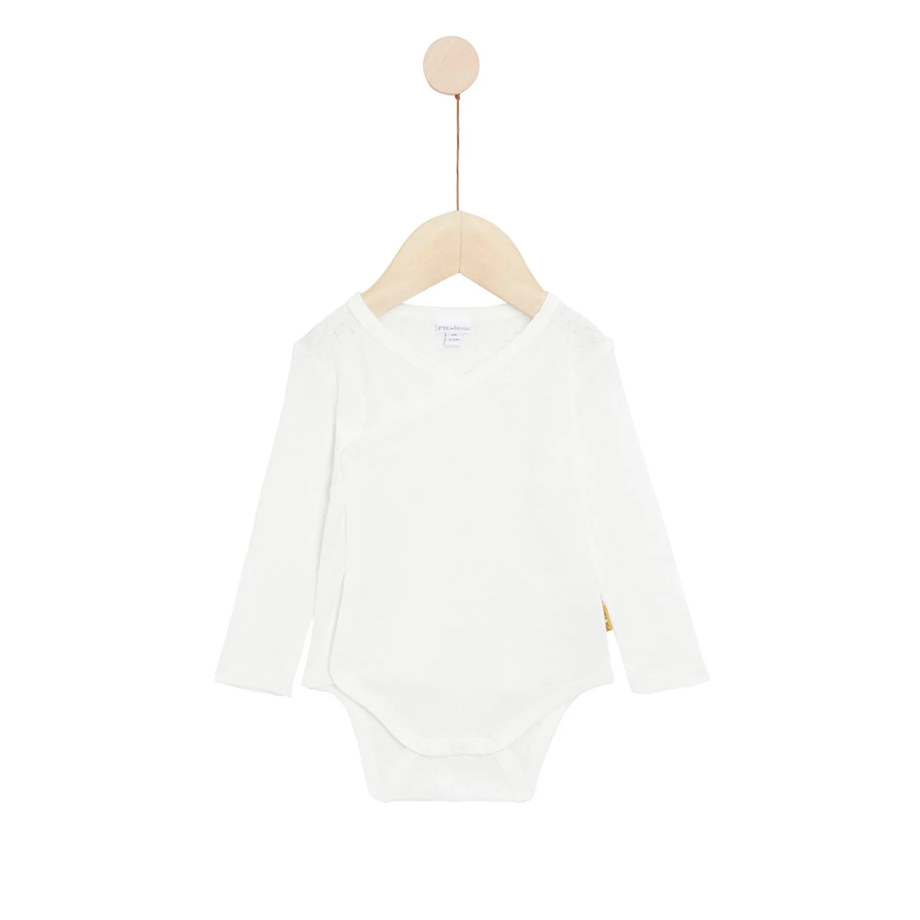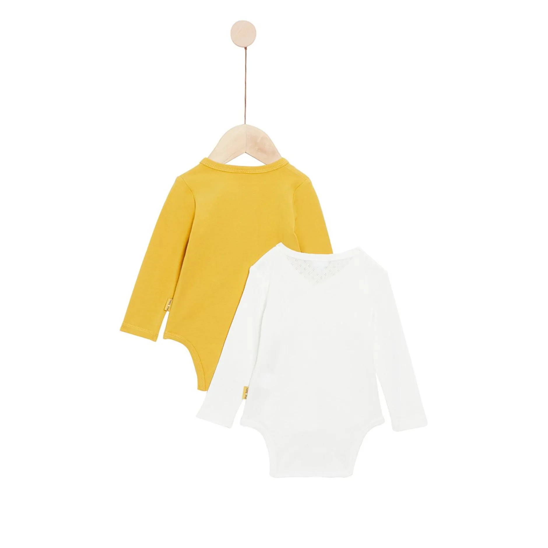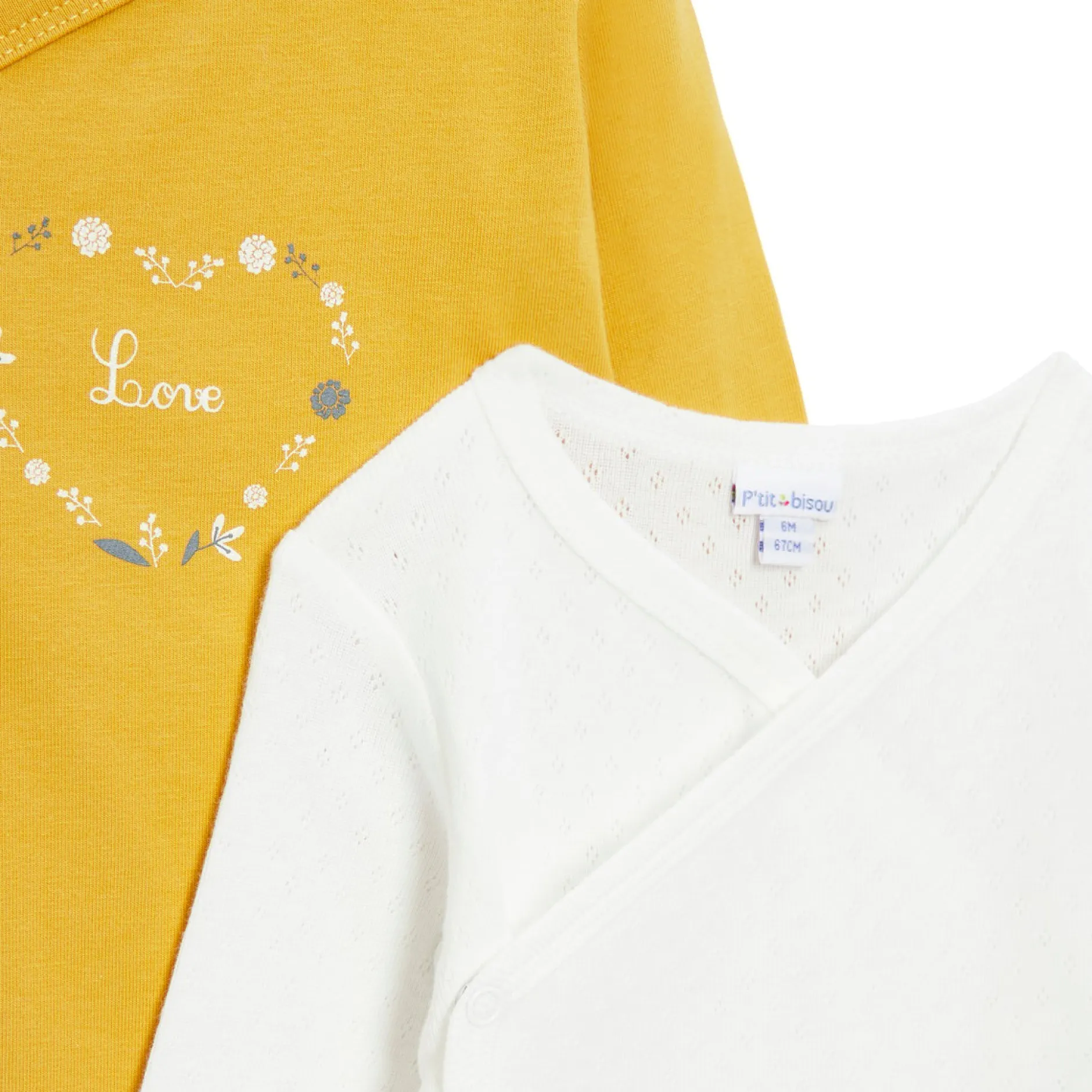Lot de 2 Bodies manches longues P’tit Bisou : 1 en jersey sur fond jaune safran et un autre en maille ajourée écrue qui rappelle les dessous des enfants d’antan.