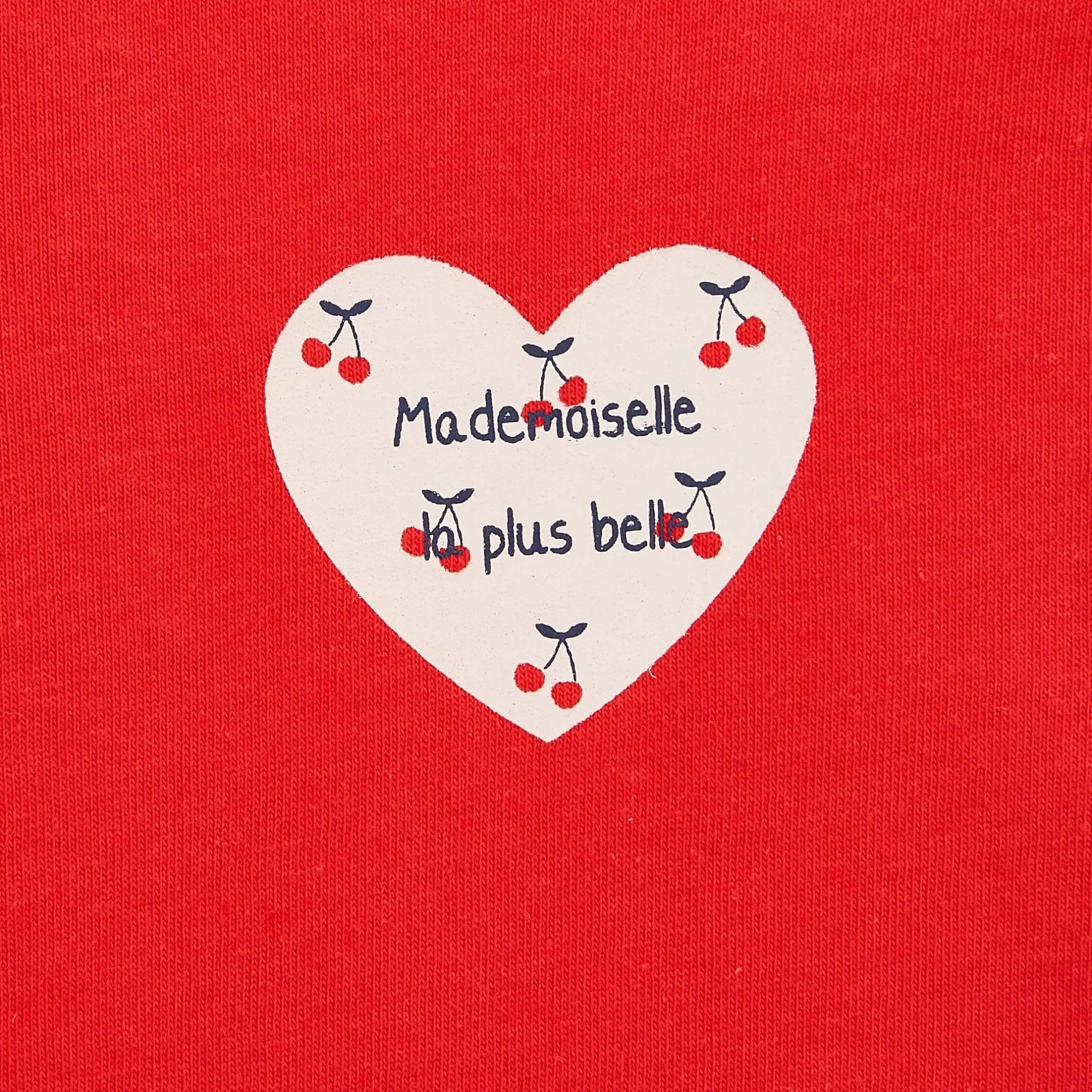 Body P’tit Bisou en jersey rouge corail. Pratique avec ses emmanchures américaines. Très belle impression devant avec un cœur où est inscrit « mademoiselle la plus belle ».