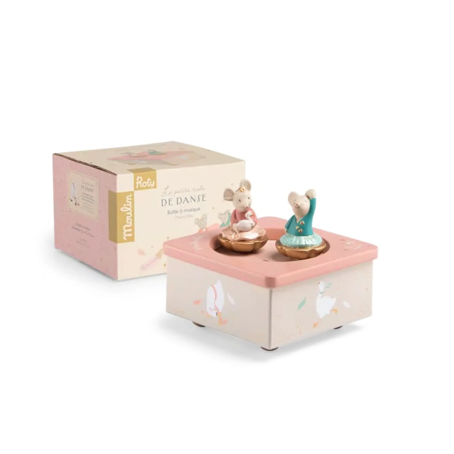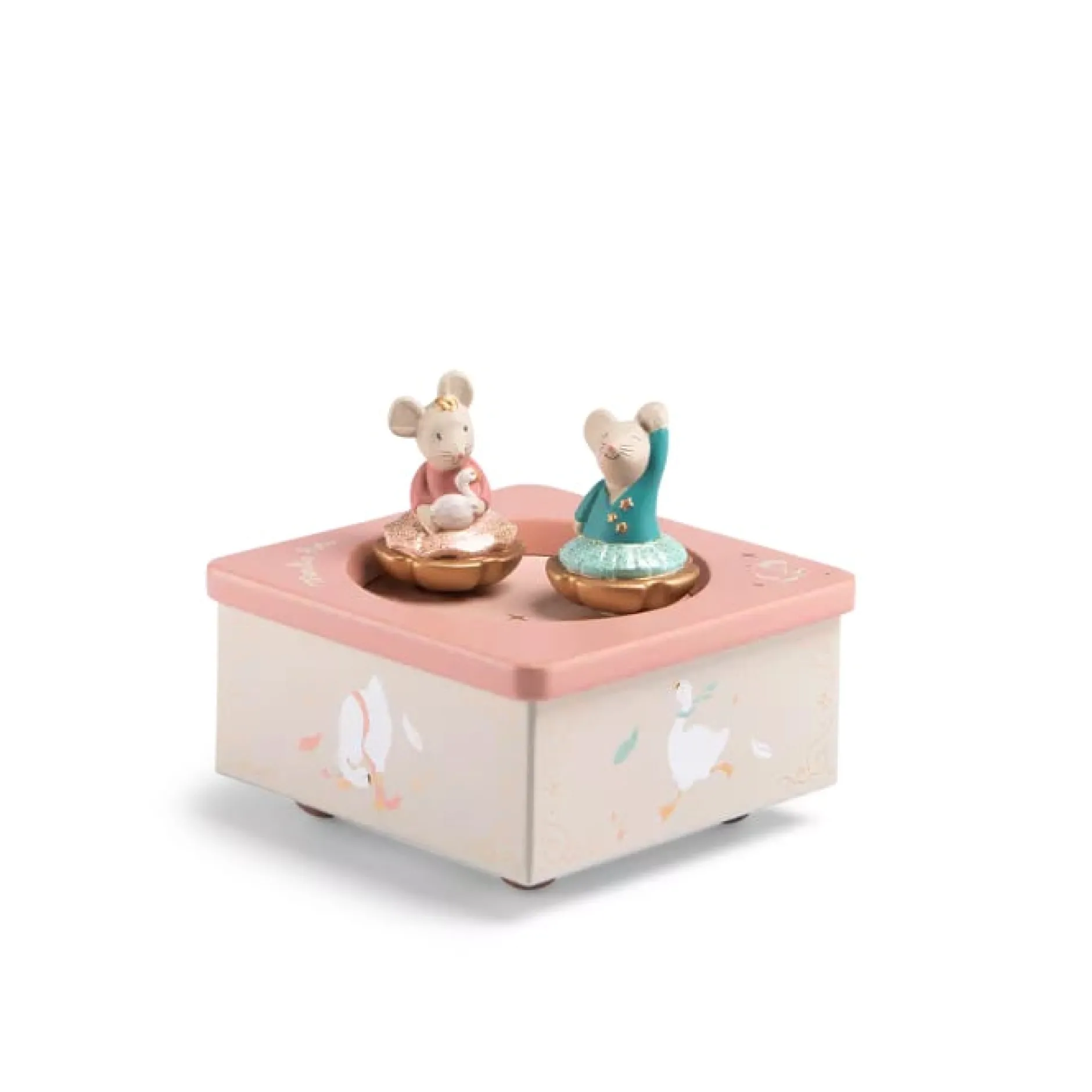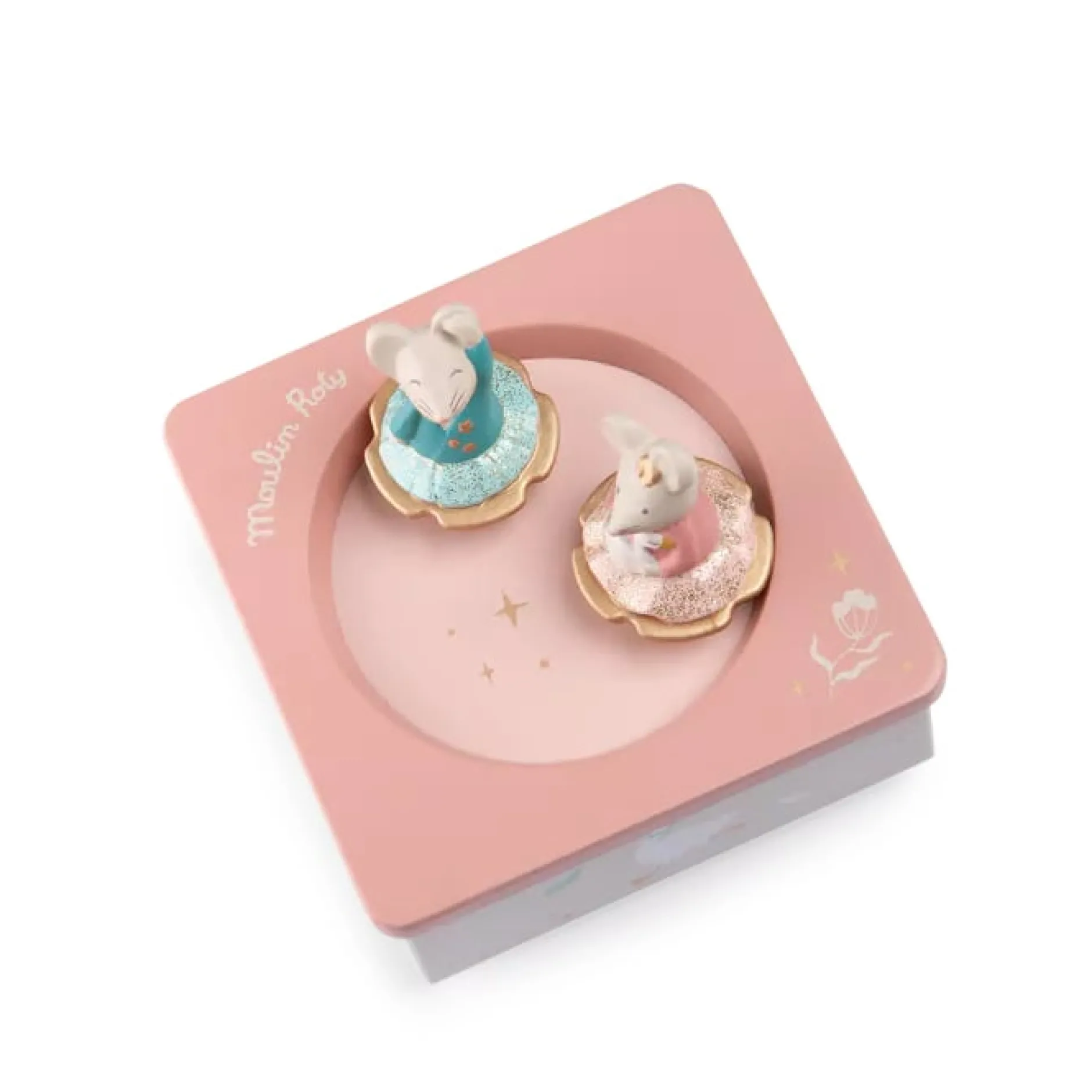 Boite à musique illustrée où 2 petites souris dansent au son d’une douce mélodie pour bercer et endormir bébé.