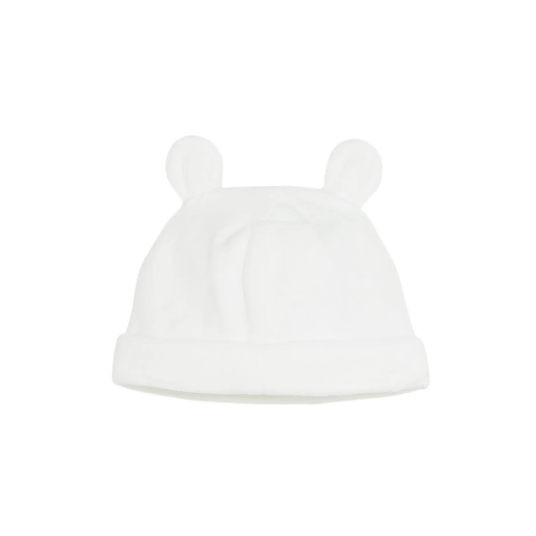 Bonnet Marèse en velours écru. Doublé de jersey écru pour le confort et la chaleur. Il allie fonctionnalité et côté ludique avec ses petites oreilles en volume et qui rappellent les oreilles du petit ourson, la mascotte du thème. Le parfait accessoire qui finit bien les silhouettes tout en maintenant la tête de bébé bien au chaud.