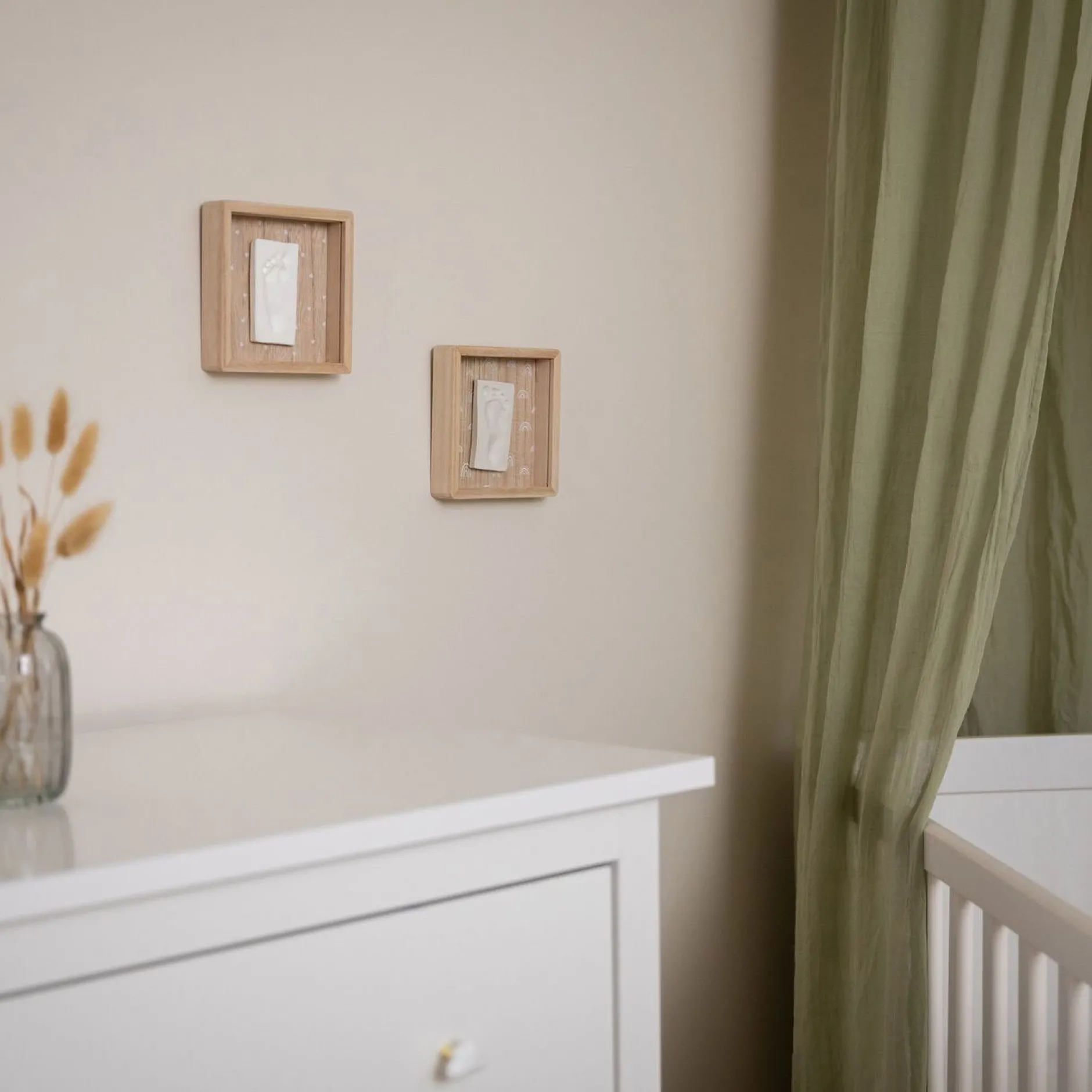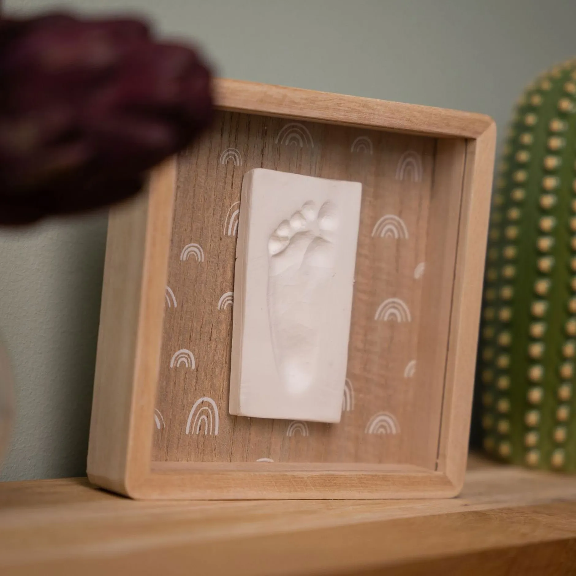 La Boîte Empreinte – Rainbow permet de créer un souvenir des petites mains ou des petits pieds de bébé. Cet élégant cadre carré avec son motif arc- en-ciel peut être posé sur un meuble ou fixé au mur pour décorer n’importe quel espace de la maison. Il comprend un cadre en bois avec couvercle de protection, un sachet de pâte hypoallergénique, un rouleau et un descriptif pour créer facilement l’empreinte.