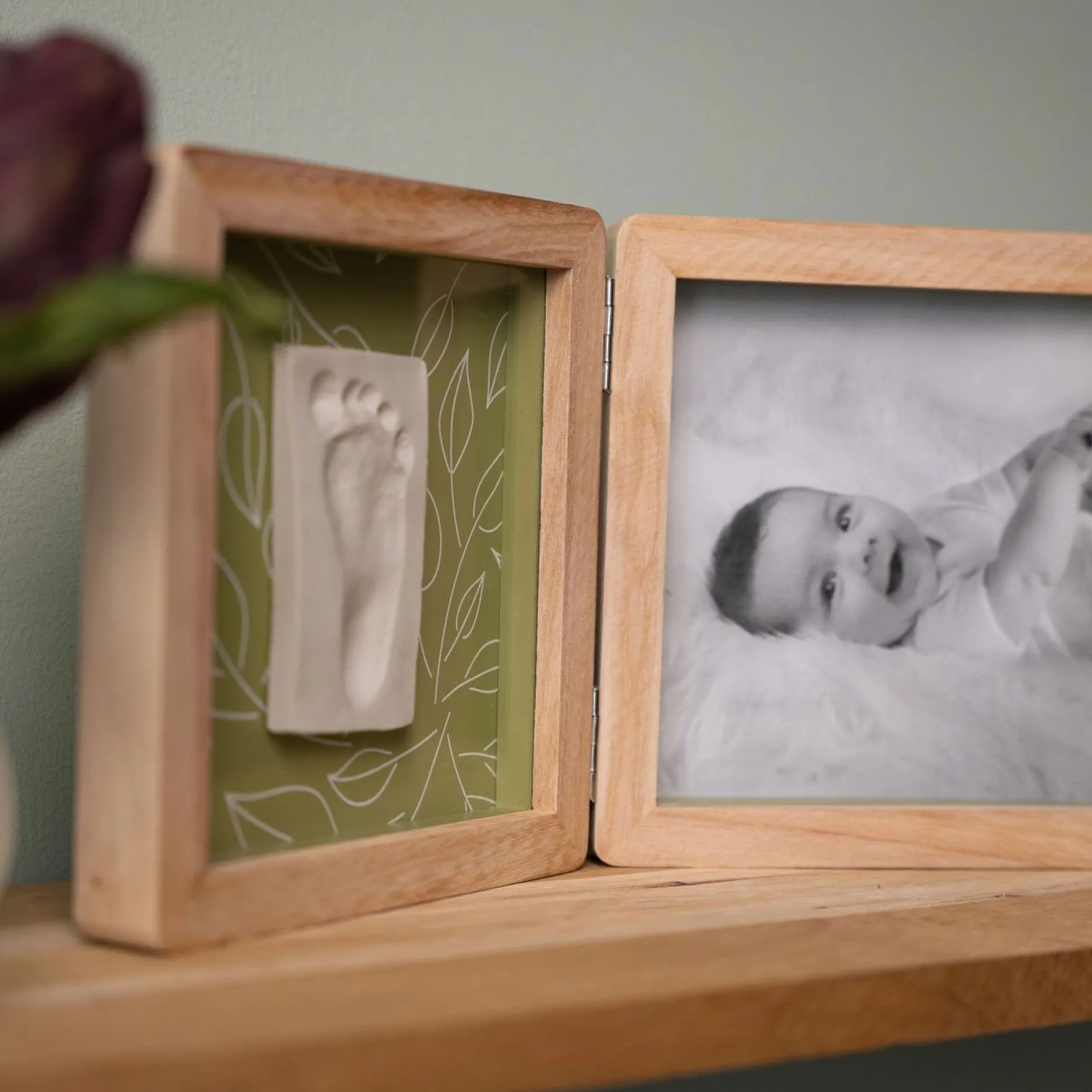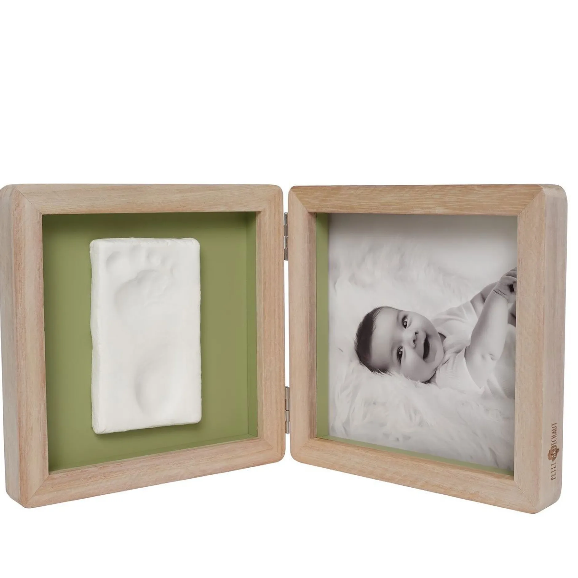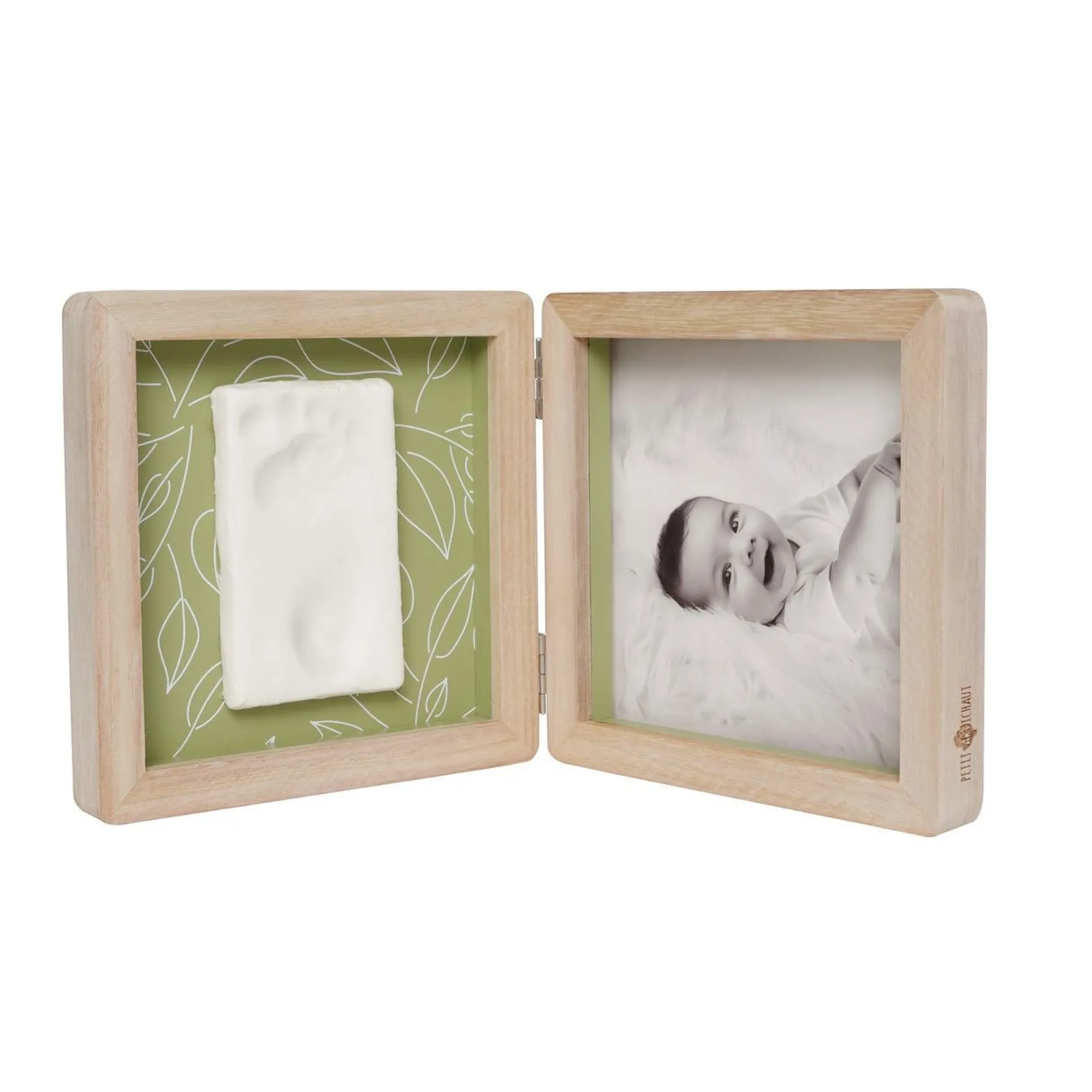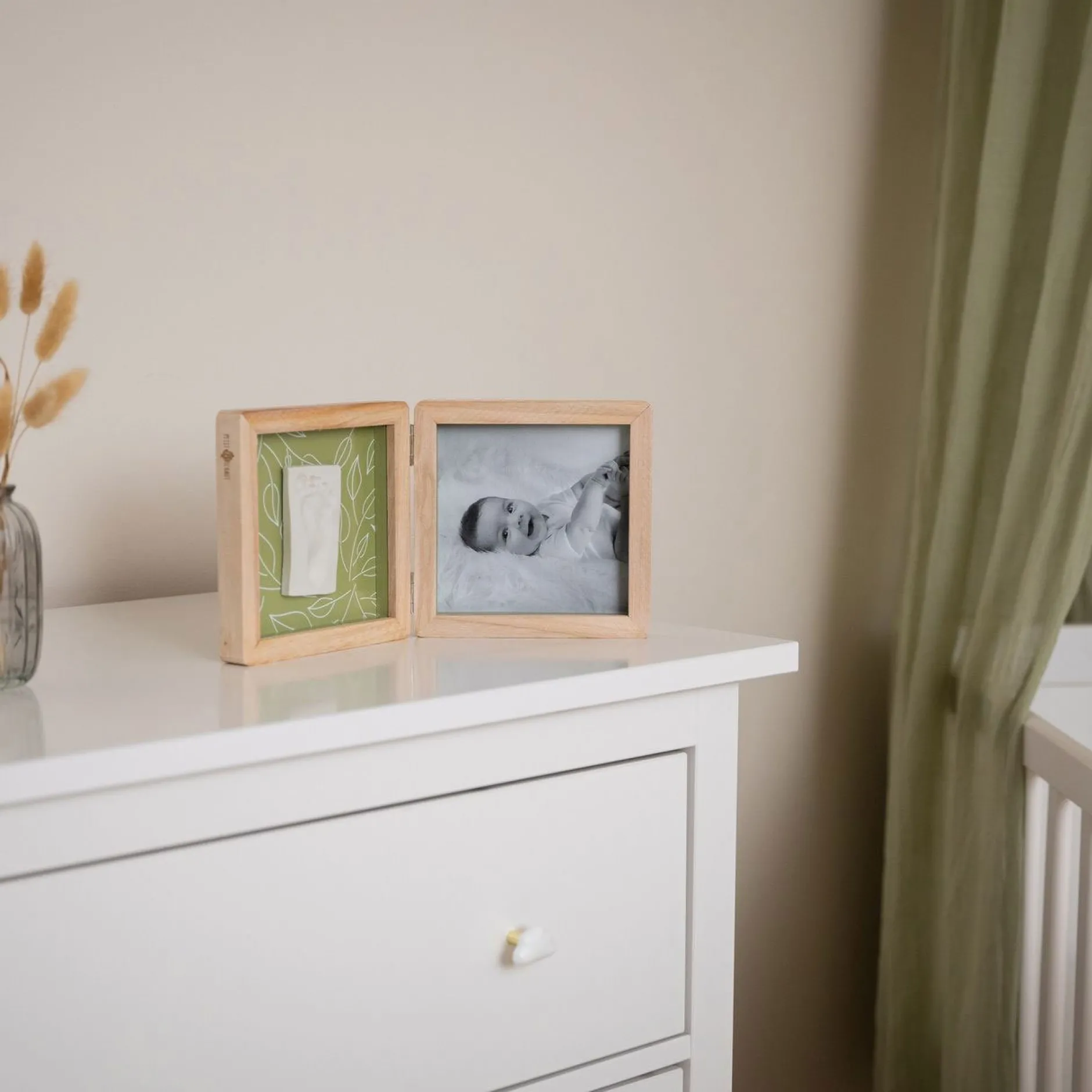 Le cadre Double – Olive Tree offre une manière unique d’exposer à la fois une photo et l’empreinte de bébé. Ce cadre à poser en 2 volets intègre harmonieusement une photo d’un côté et une empreinte de l’autre. Il apporte une touche poétique à la décoration avec son fond recto verso de couleur vert olive et son motif de feuillage. Le kit comprend de la pâte hypoallergénique, un rouleau et un descriptif pour créer facilement l’empreinte.