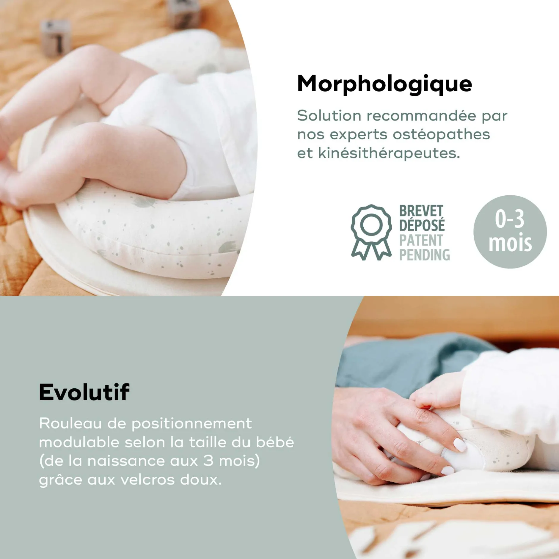 - Rouleau de positionnement modulable selon la taille de l’enfant grâce au velcro doux