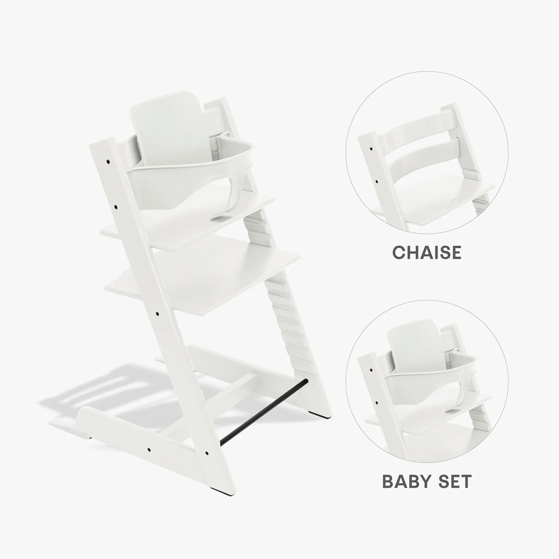 Le Baby Set² fournit un soutien latéral et dorsal à votre bébé, lui permettant de développer sa capacité à s’asseoir. Le pack chaise haute Tripp Trapp® est idéal pour les parents en quête de solutions simples et pratiques. Il inclut tout ce dont vous avez besoin pour asseoir votre enfant à la table familiale.