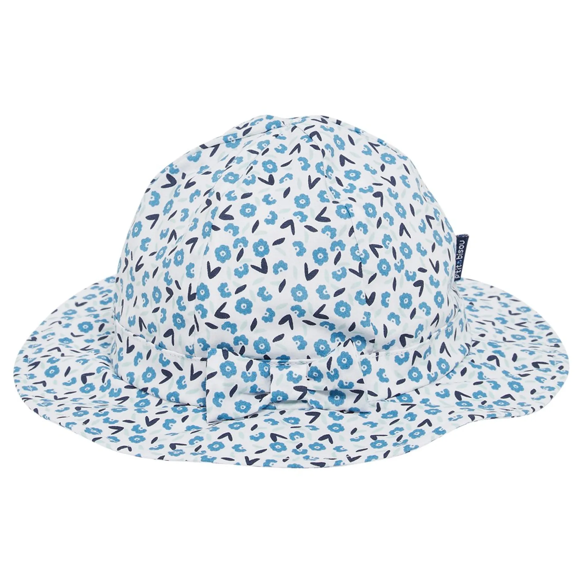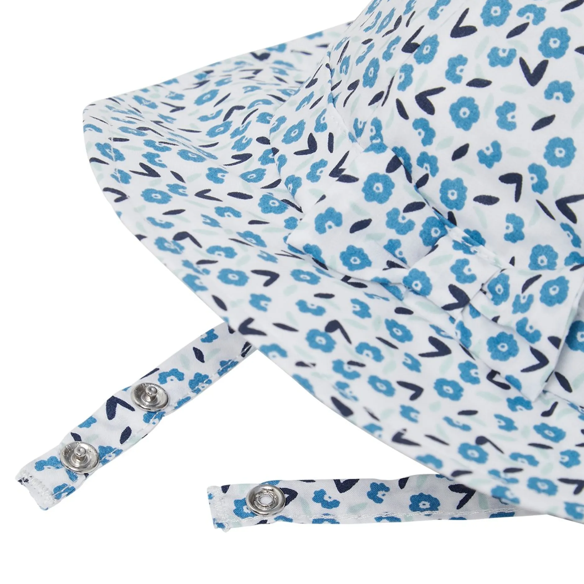 Chapeau P’tit Bisou en voile de coton blanc en imprimé « petites fleurs » dans les camaïeux de bleus avec un joli nœud sur le côté pour une finition soignée. Petite patte réglable par pressions pour fermeture. La pièce indispensable en été pour se protéger du soleil quand bébé ira se promener dehors !
