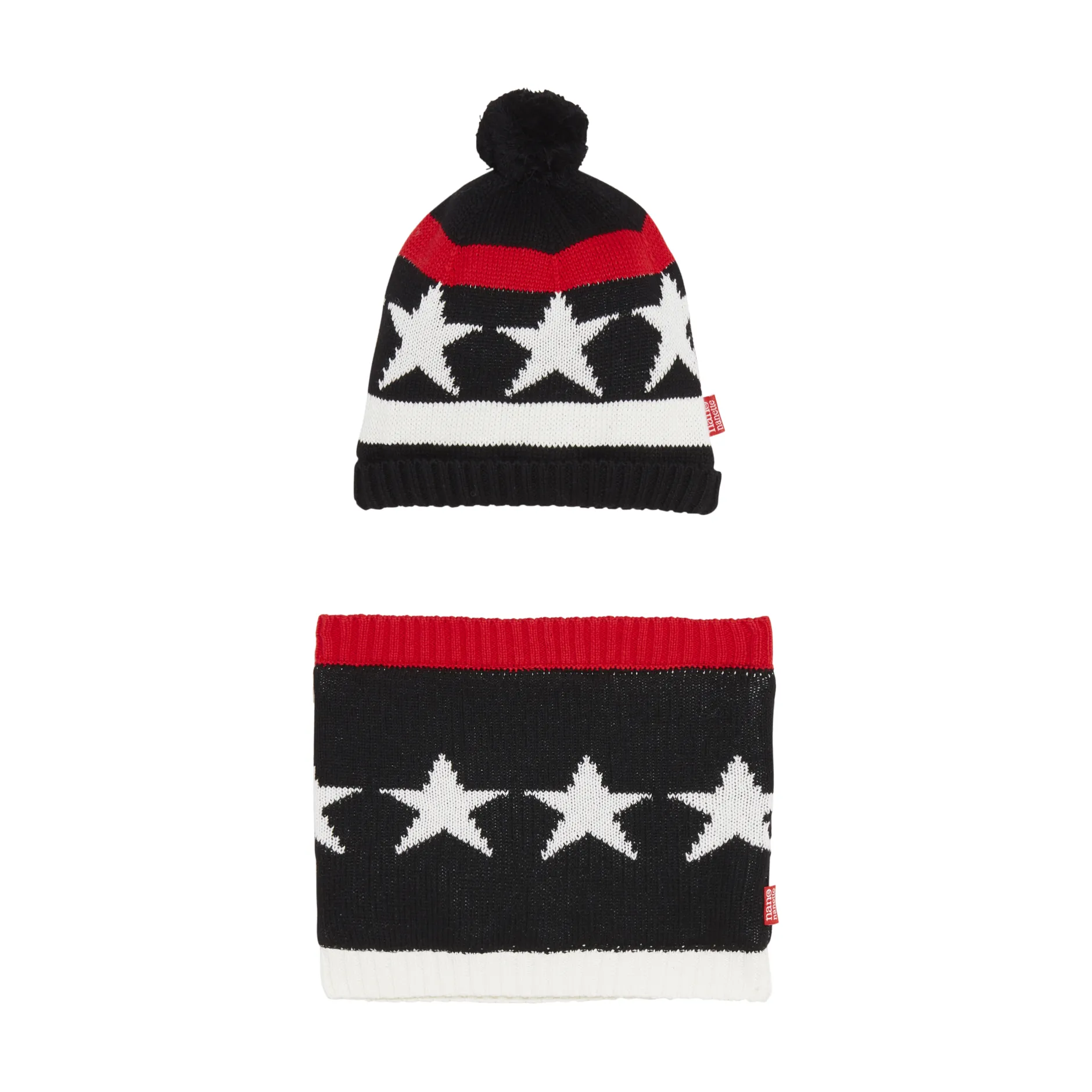 Très stylée cette parure en coloris gris anthracite, rouge et écru. De très beaux motifs étoiles en jacquard sur le snood et le bonnet et joli pompon sur le dessus de la tête. Ce set est doublé de polaire pour plus de chaleur et de confort.