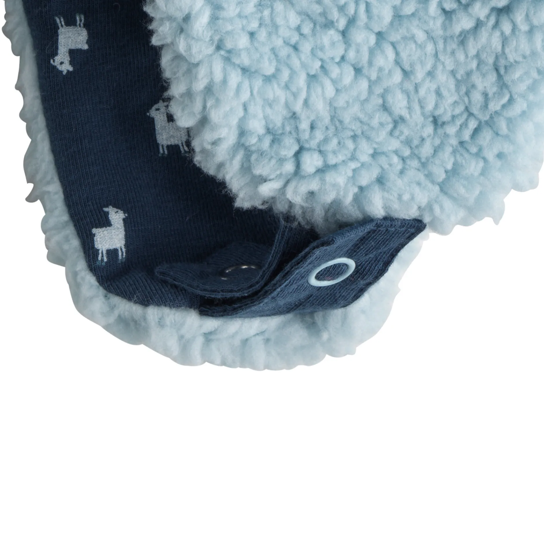 Chapka P’tit Bisou en fausse fourrure moutonnée bleu ciel doublée de jersey imprimé »petits lamas » pour plus de confort. Les oreilles et la tête seront bien maintenues au chaud. Petite patte réglable par pressions pour fermeture pour s’adapter à tous les périmètres crâniens. La pièce indispensable en hiver quand bébé ira se promener dehors !