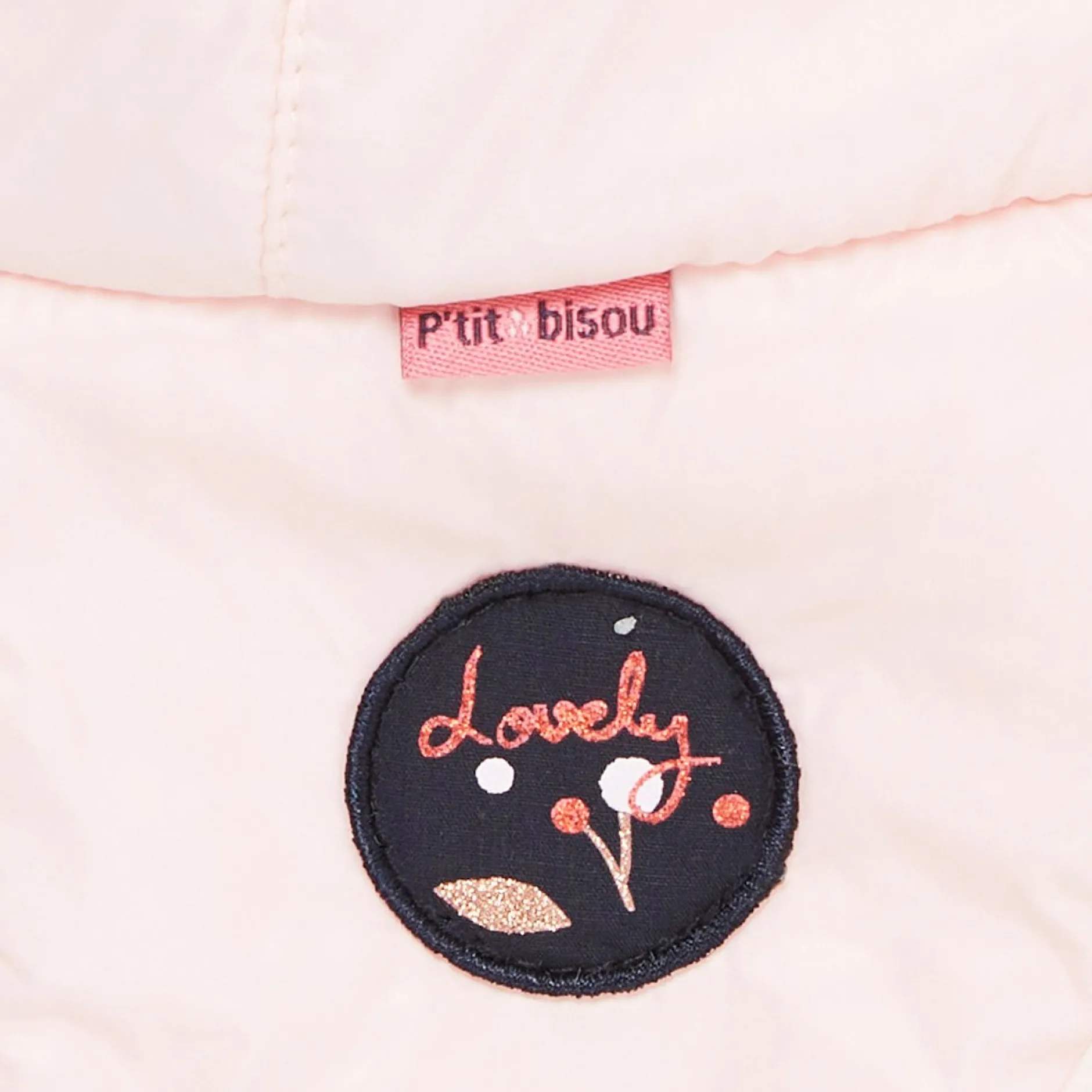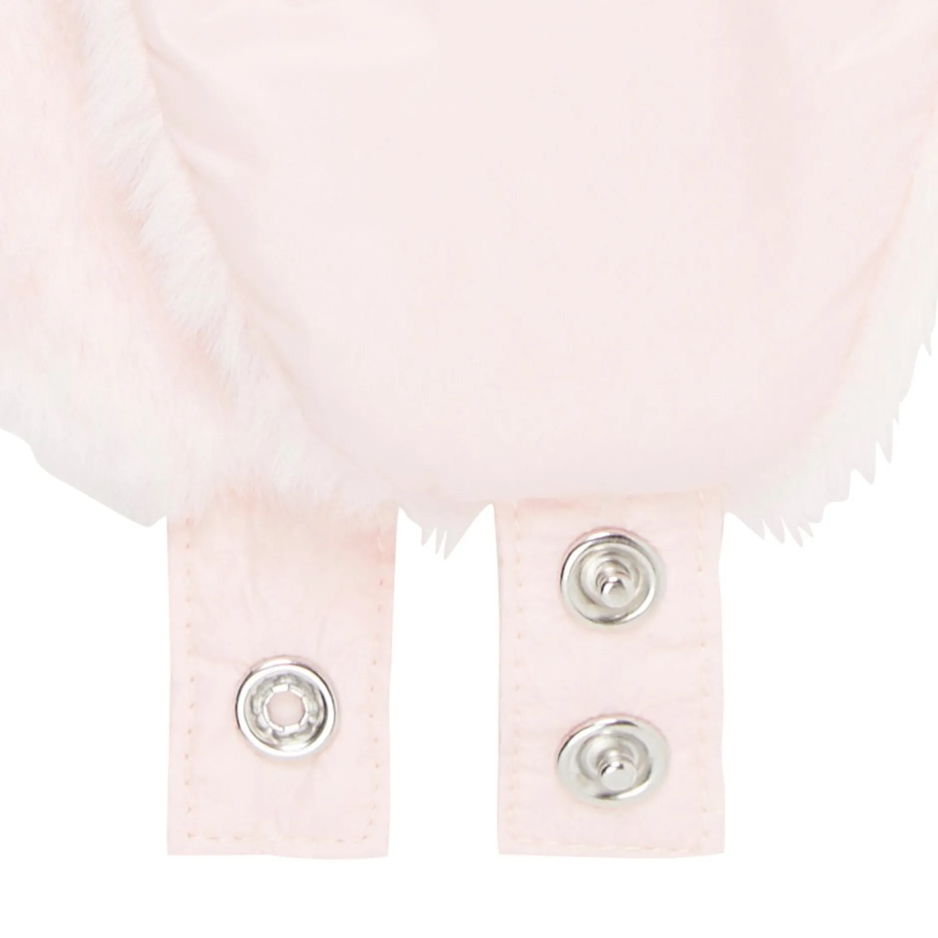 Chapka P’tit Bisou en nylon en coloris rose pâle. Elle est doublée de fourrure rose pâle toute douce et est ouatinée ! La belle pièce qui vient embellir toutes les tenues et qui maintiendra la petite fille bien au chaud pendant les journées un peu fraîches. Très fonctionnelle avec sa patte pressionnée pour bien maintenir la chapka sur la tête de l’enfant.