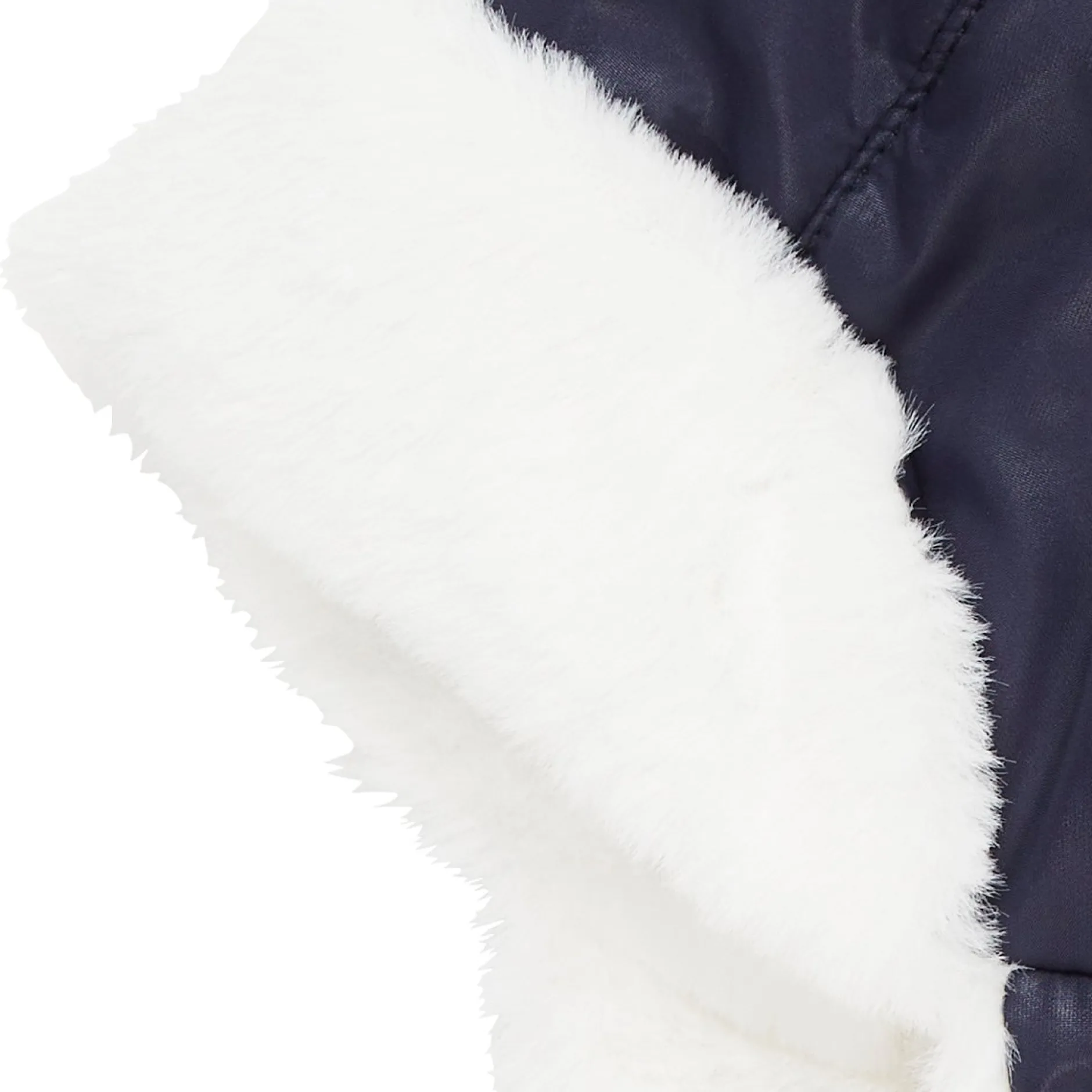 Chapka P’tit Bisou en nylon en coloris bleu marine. Elle est doublée de fourrure écrue toute douce et est ouatinée ! La belle pièce qui vient embellir toutes les tenues et qui maintiendra le bébé bien au chaud pendant les journées un peu fraîches. Très fonctionnelle avec sa patte pressionnée pour bien maintenir la chapka sur la tête de l’enfant. Le parfait petit accessoire qui vient terminer les jolies silhouettes du thème !