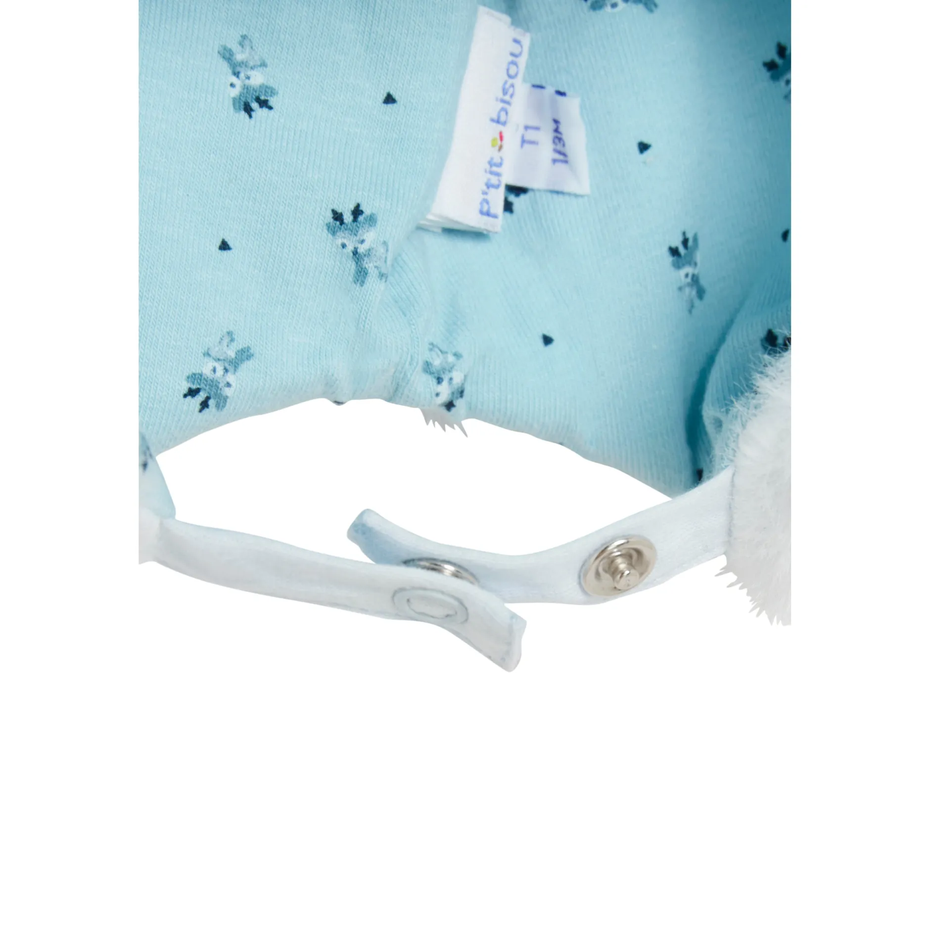 Chapka P’tit Bisou en fausse fourrure très douce bleu pâle doublée de jersey imprimé des petits daims.