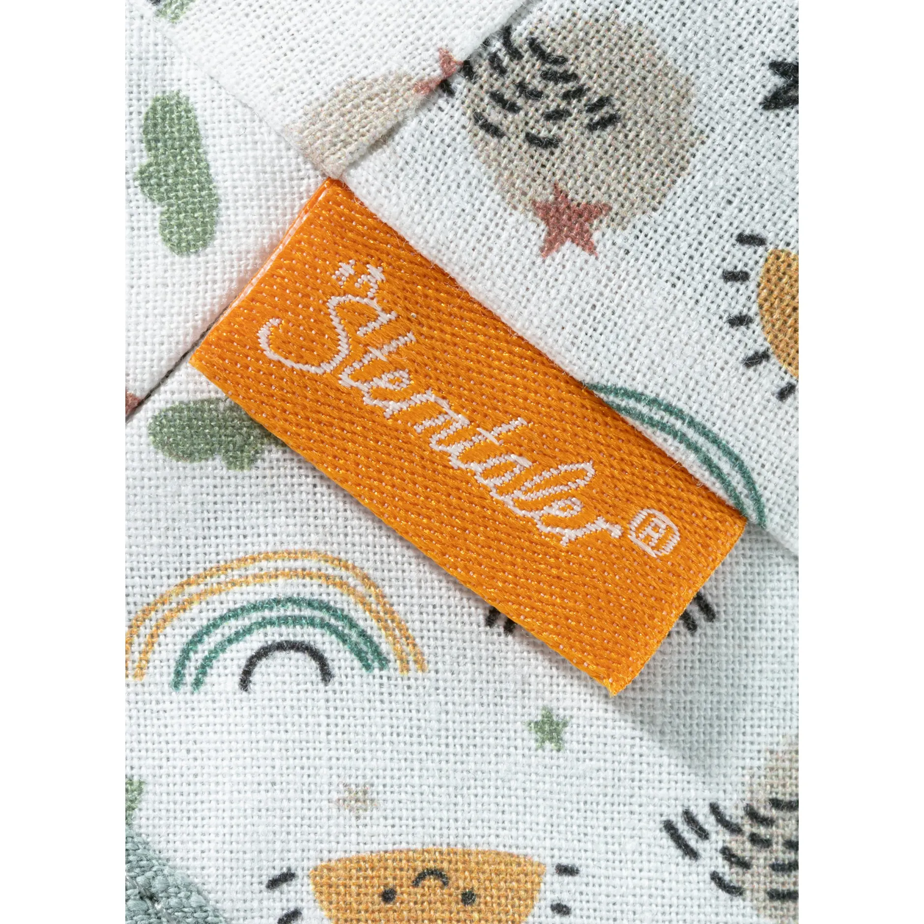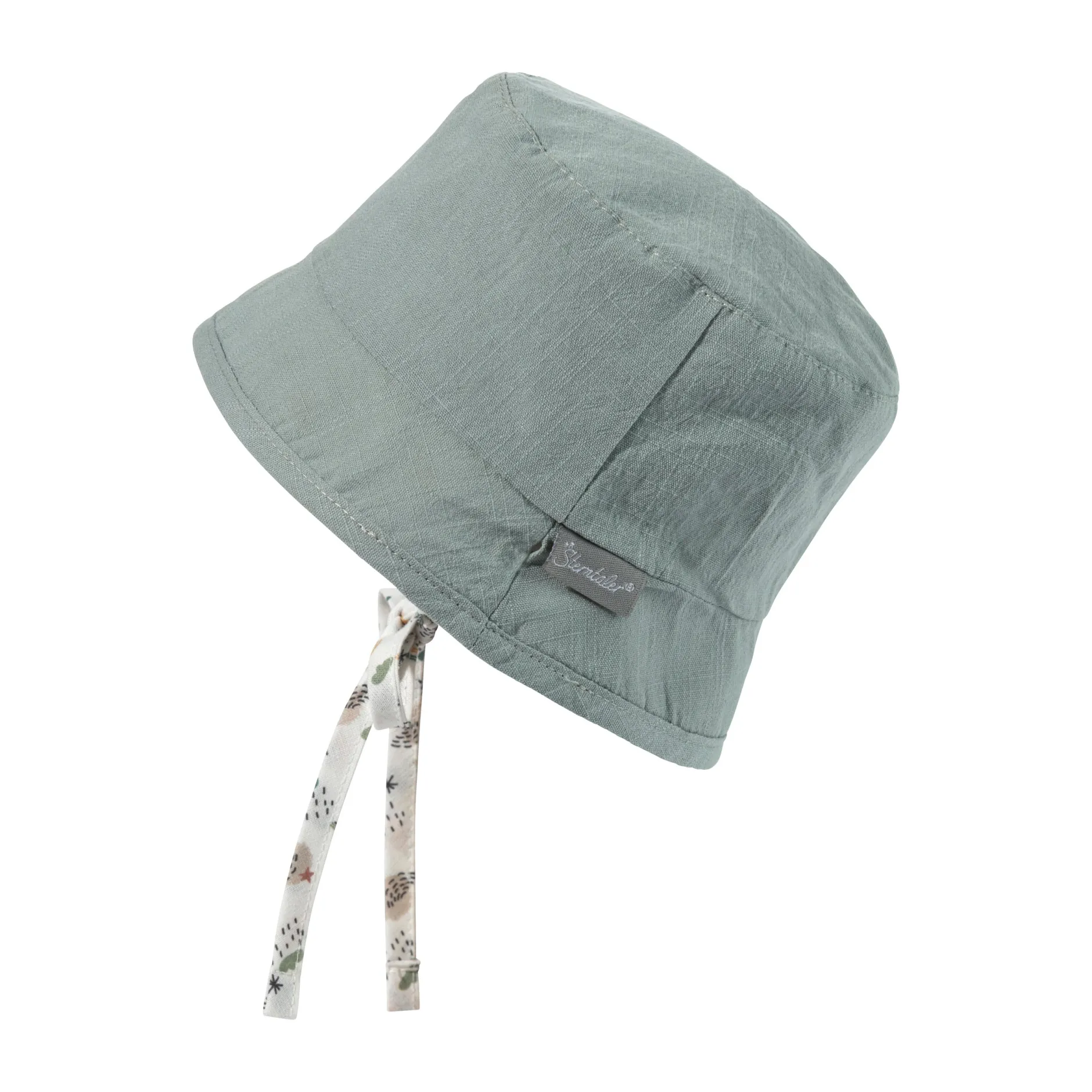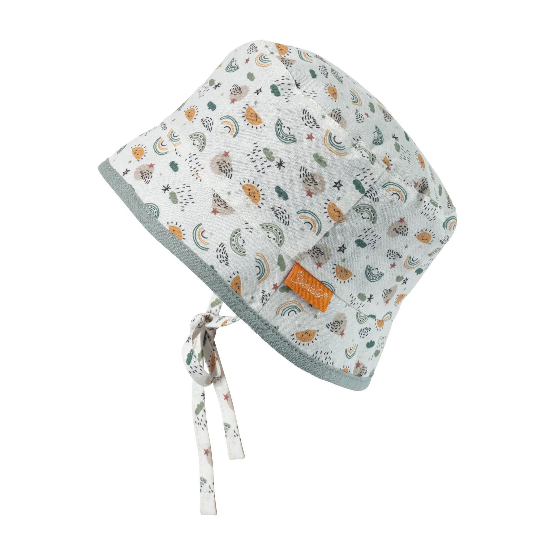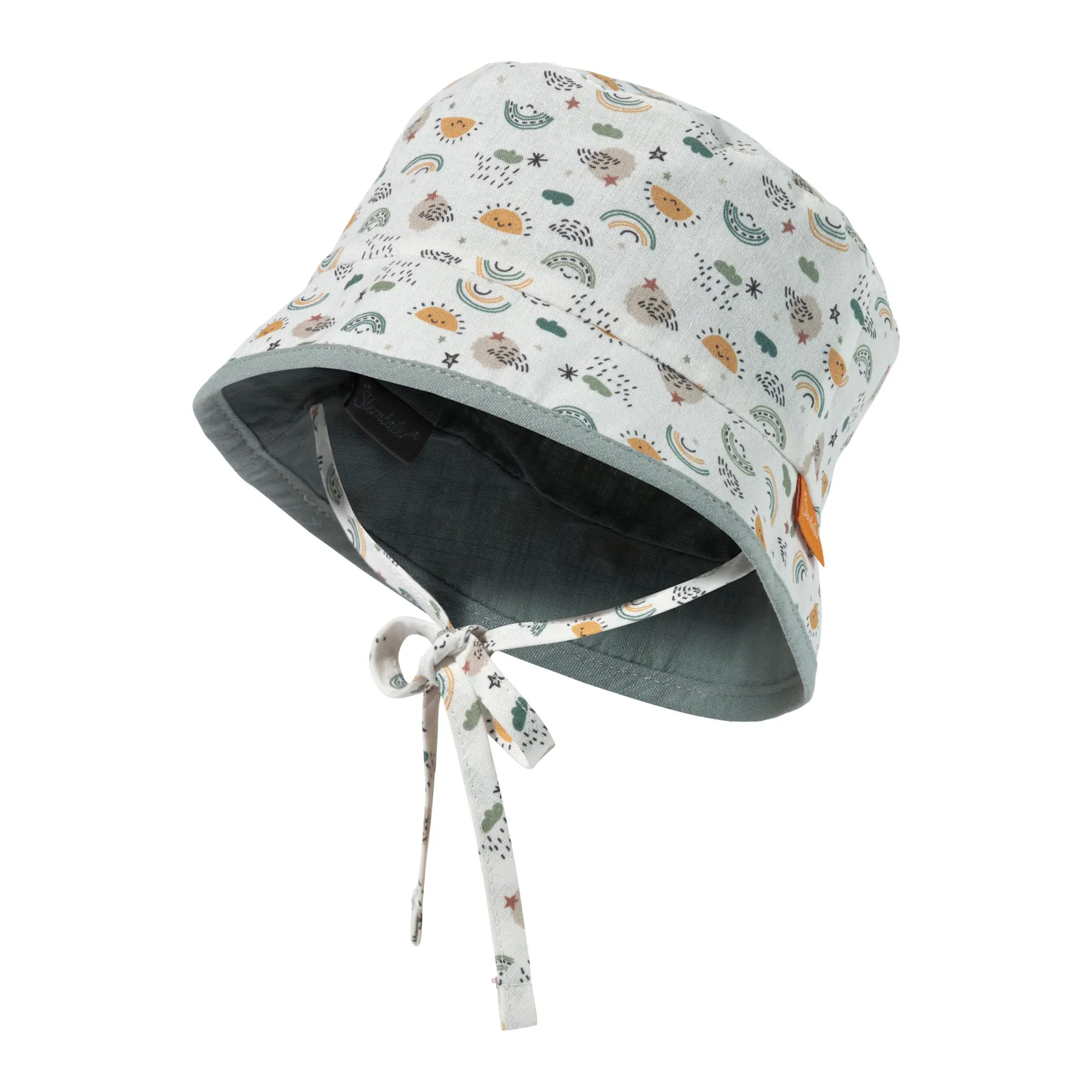 Chapeau Bob réversible en coton imprimé d’arcs-en-ciel et soleils, avec liens à nouer, doublé en coton texturé look lin