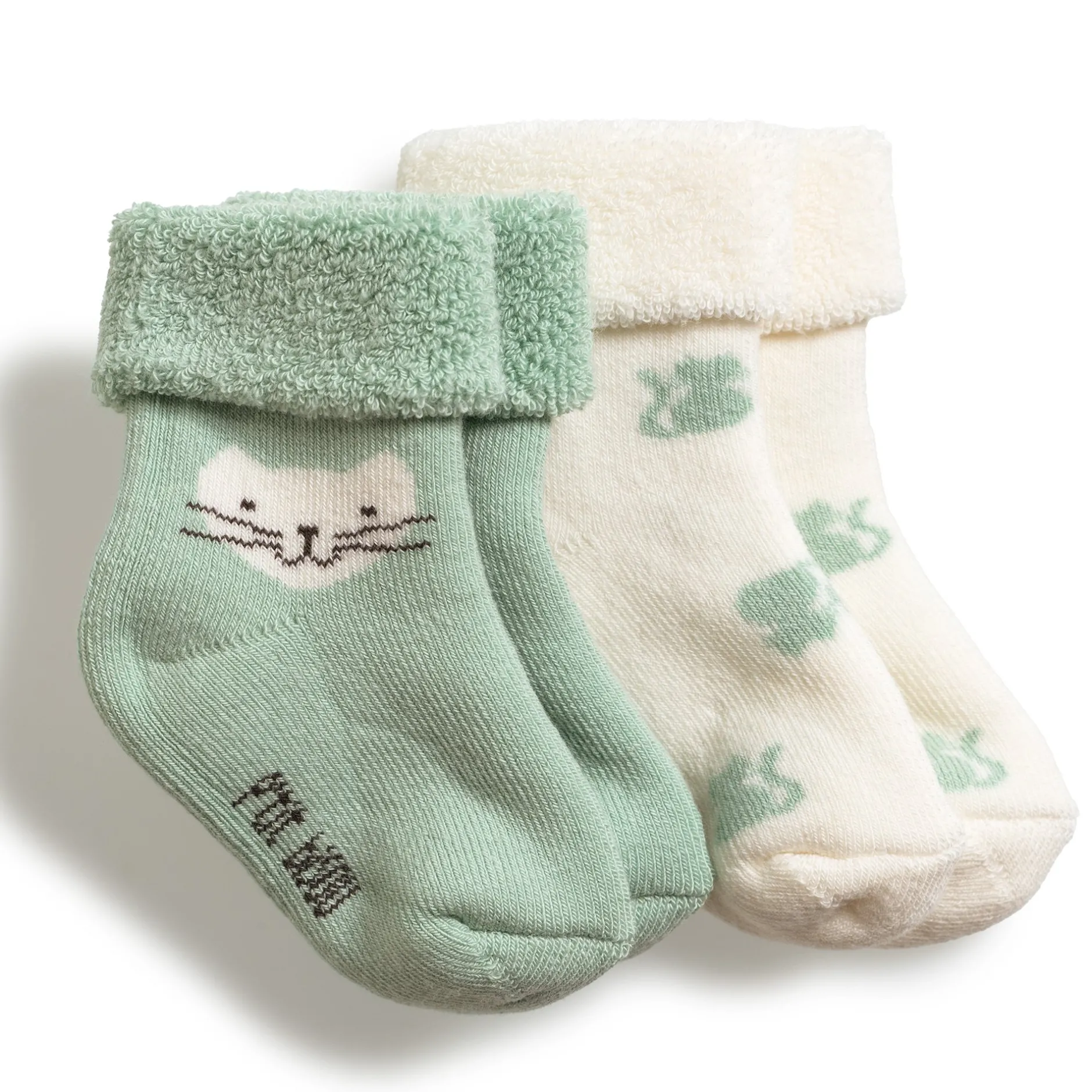 Lot de 2 chaussettes P’tit Bisou en bouclette. 1 paire en écru avec l’imprimé « petits chatons » du thème dans les coloris vert sauge. 1 paire en coloris vert sauge avec une petite tête de chaton en jacquard sur le côté.