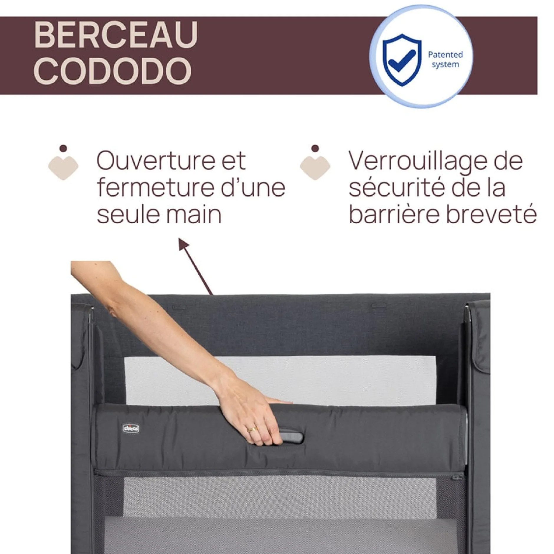 Chicco Next2Me Forever est équipé d’un système de sécurité breveté qui empêche la barrière latérale de rester abaissée lorsque le lit n’est pas fixé au lit des parents à l’aide des sangles. Ce système permet une utilisation sûre et correcte du berceau dans toutes les configurations.