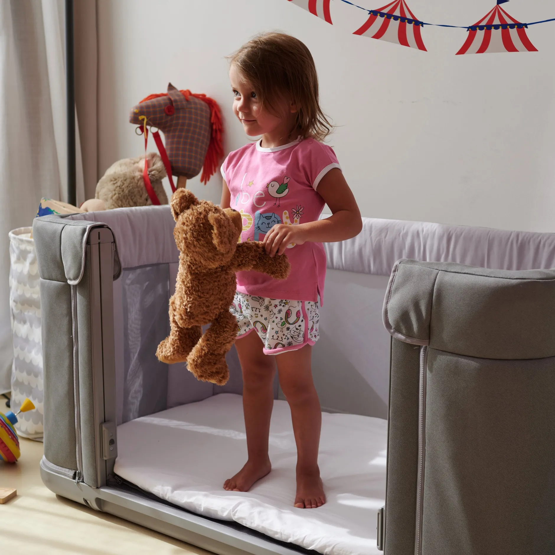 Réglable en hauteur sur 11 positions et pieds pliables pour s’adapter facilement aux lits des parents.