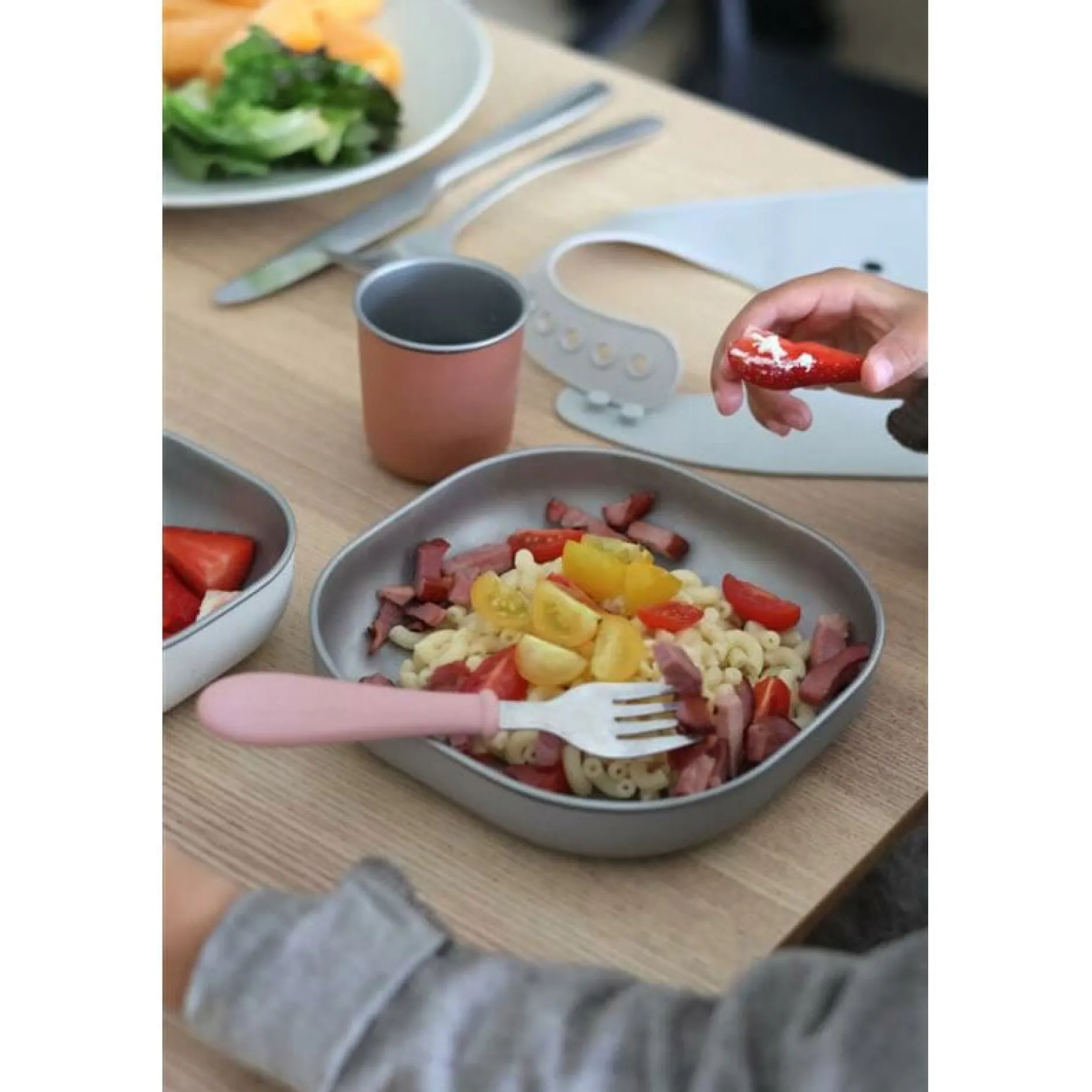 - SET COMPLET: composé d’une assiette, d’un bol et d’un petit verre ergonomiques en inox