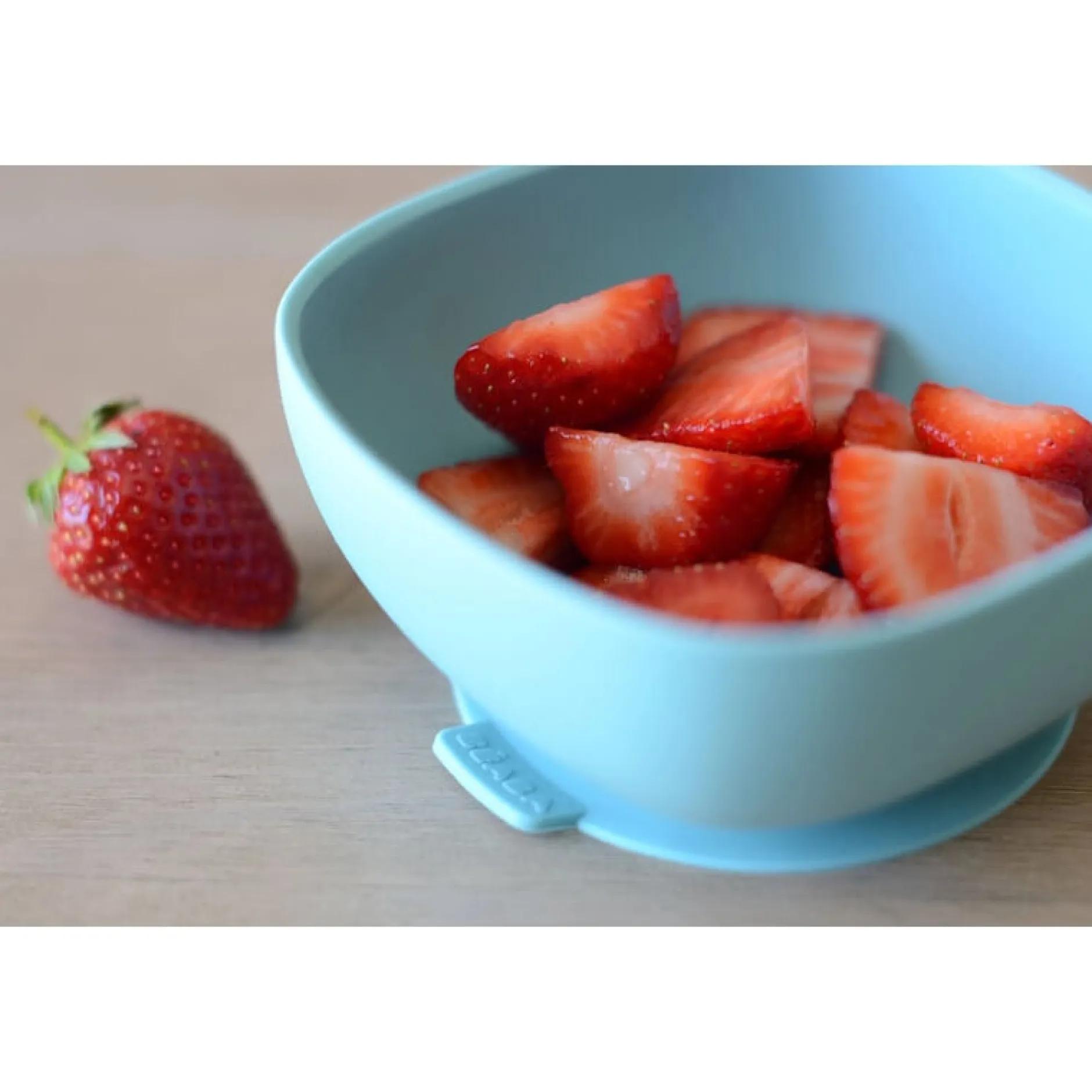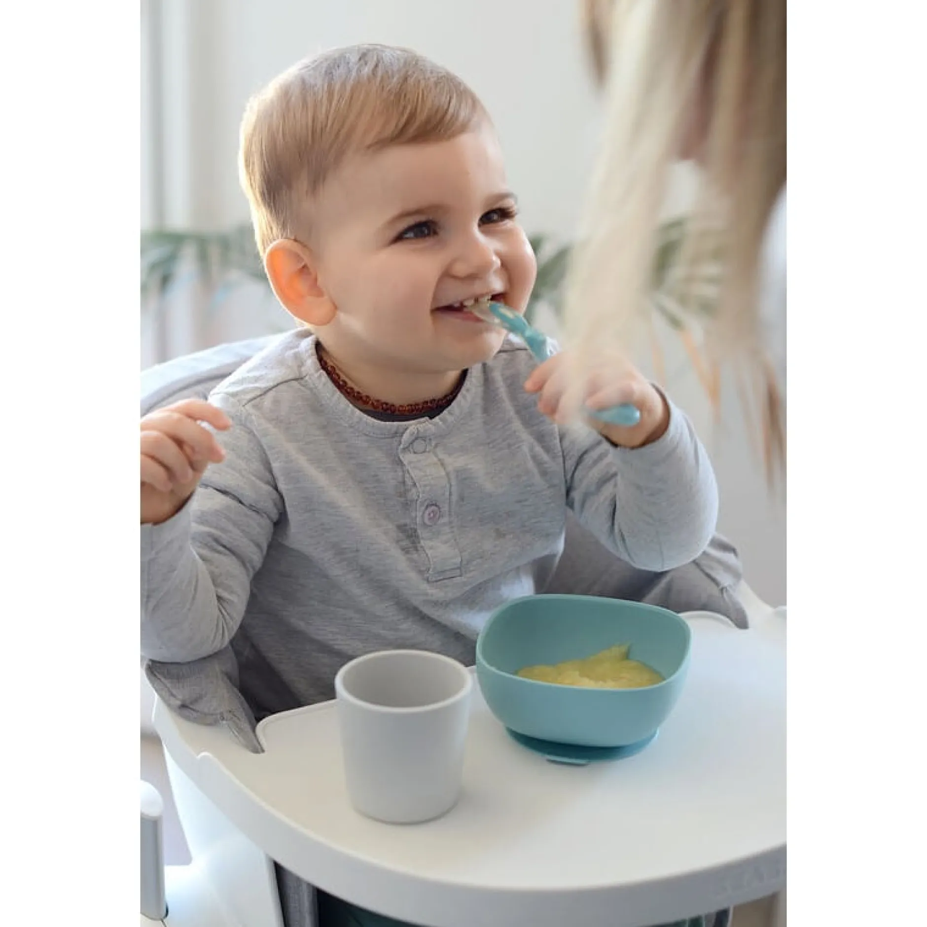 Gamme repas silicone composée d’une assiette et d’un bol avec ventouse, ainsi que d’un verre (cuillère 2ème âg…