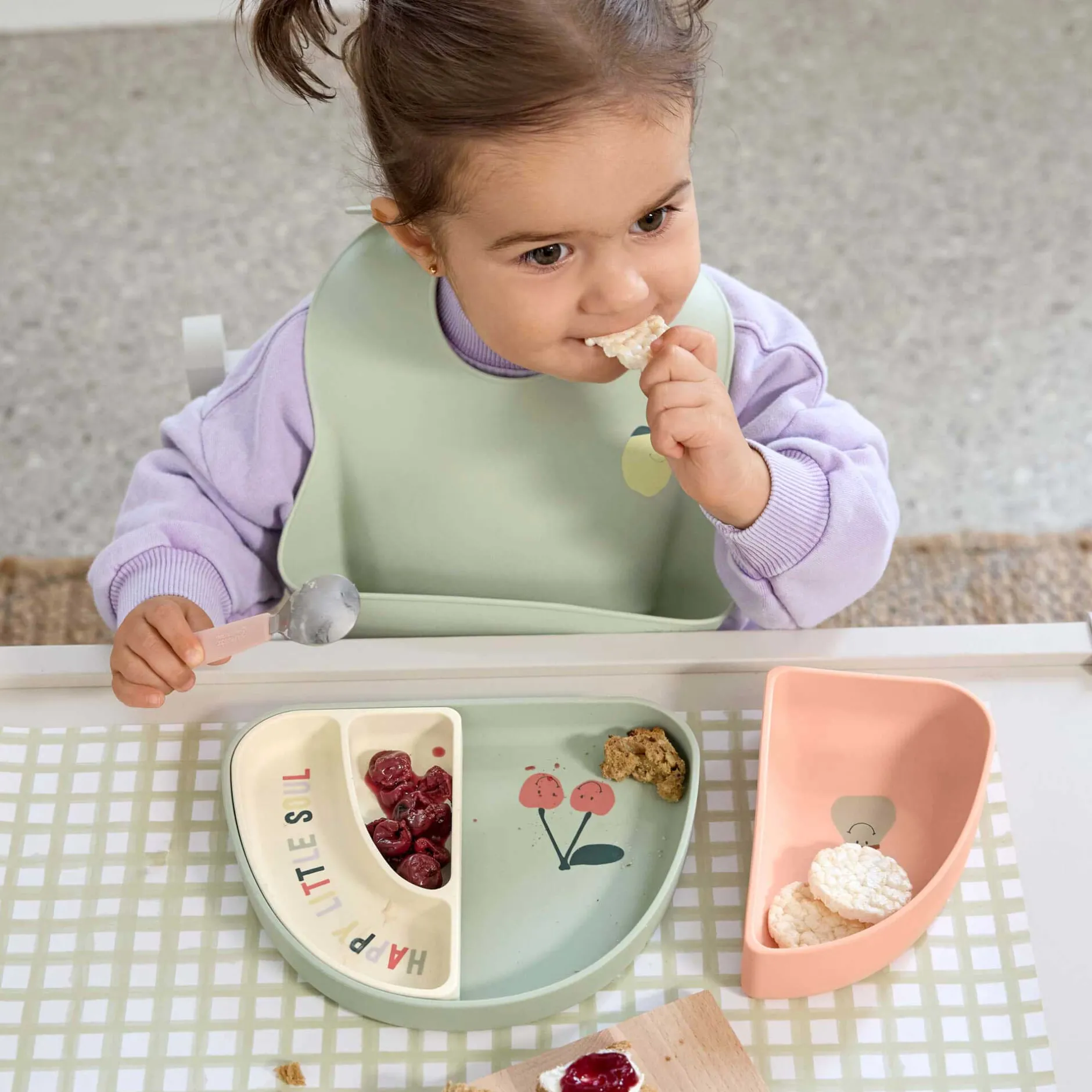 Des fruits rigolos, un grand plaisir ! Le set de vaisselle LÄSSIG en silicone en forme d’arc-en-ciel se divise en trois compartiments séparables offrant de nombreuses possibilités créatives pour le service. Pour mélanger, trier, tremper ou avaler manger à la cuillère : les enfants vont adorer !