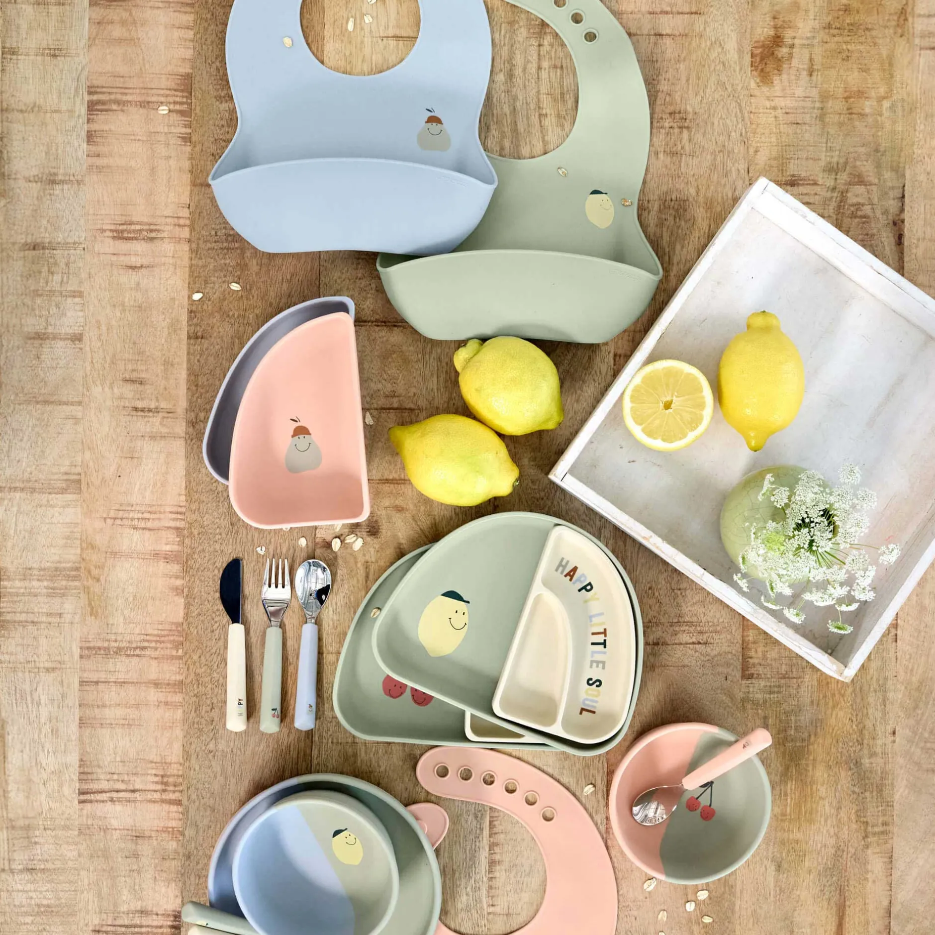 Ce set de vaisselle en silicone complète parfaitement les nombreux autres produits joyeux de la collection Happy Fruits et permet de s’amuser et varier les plaisirs à chaque repas !