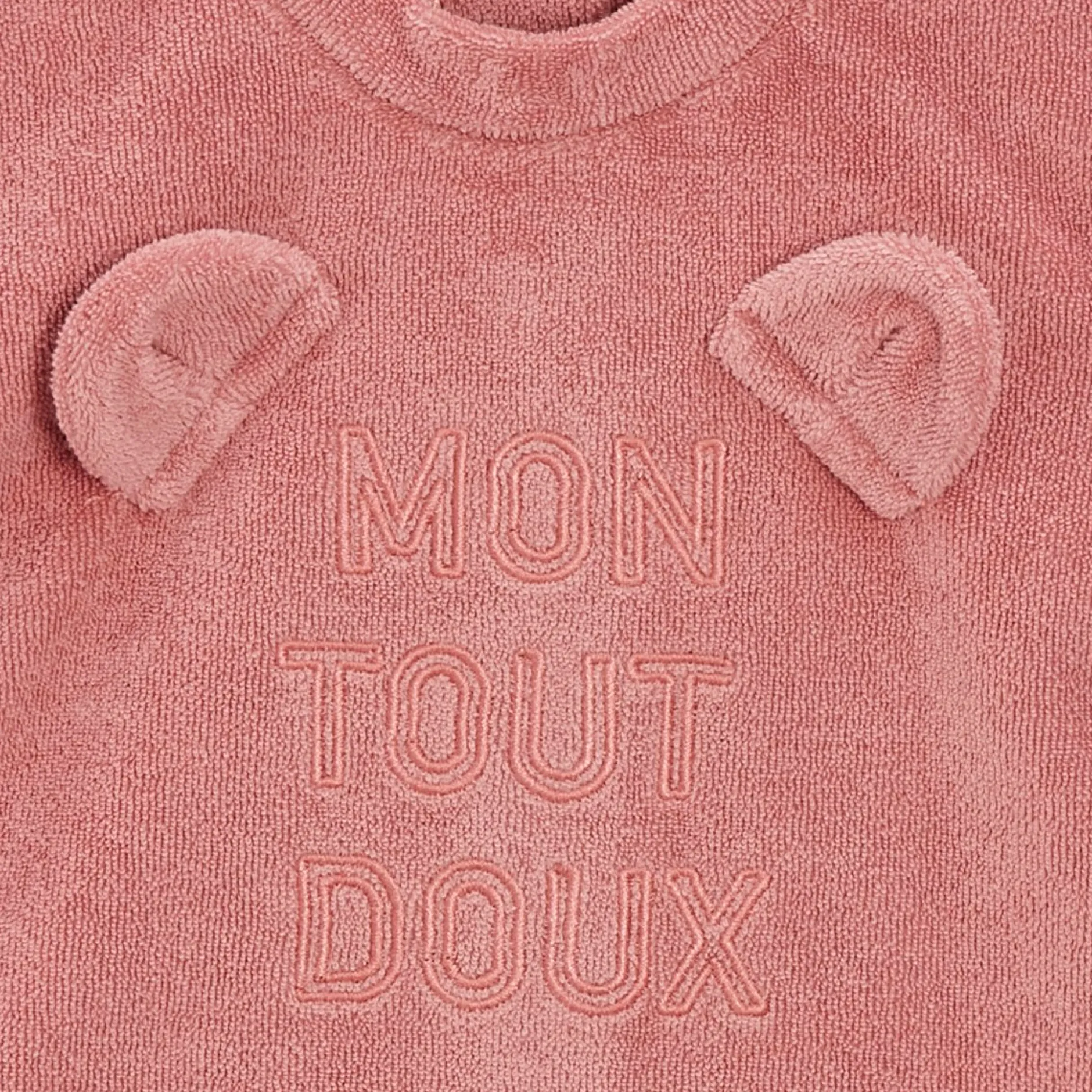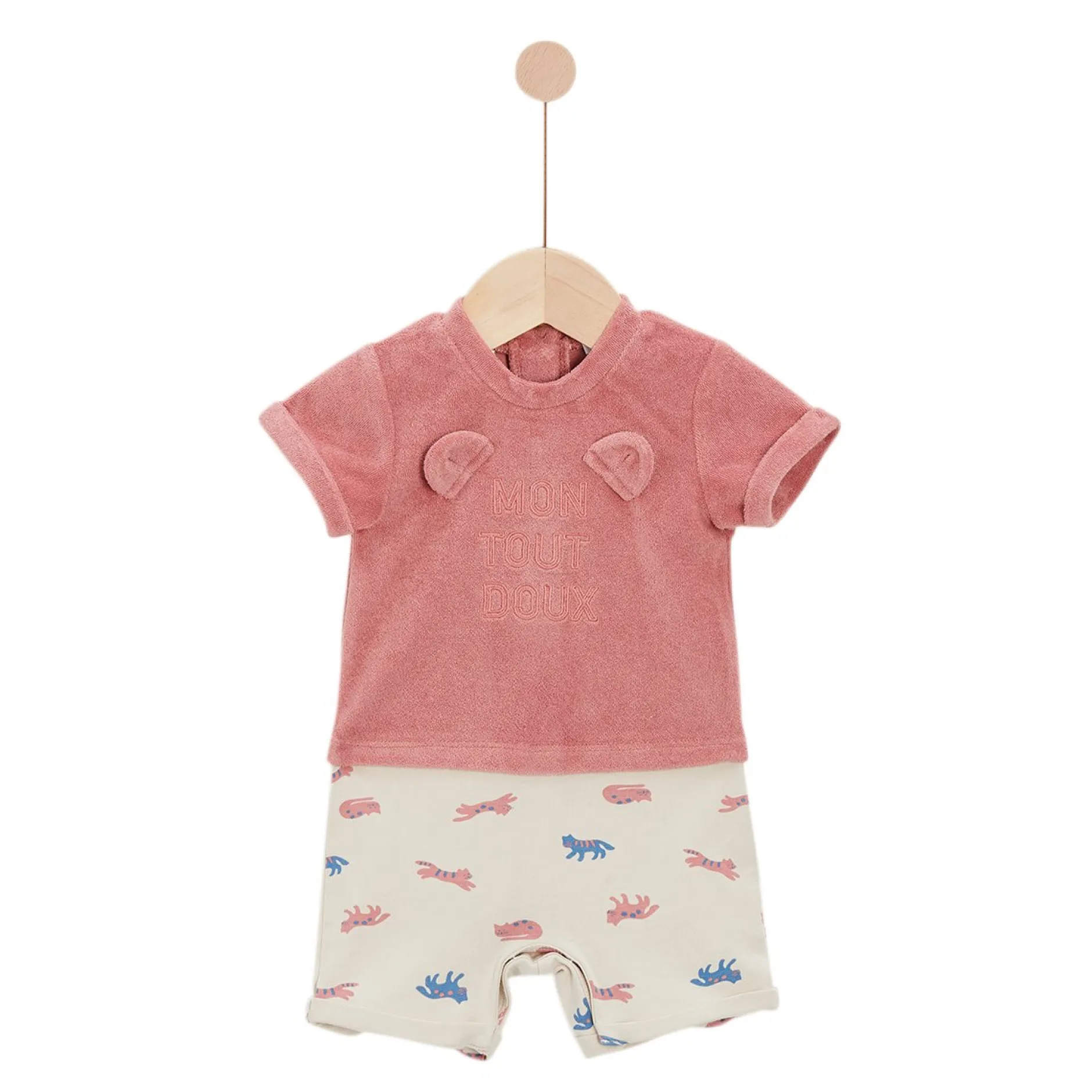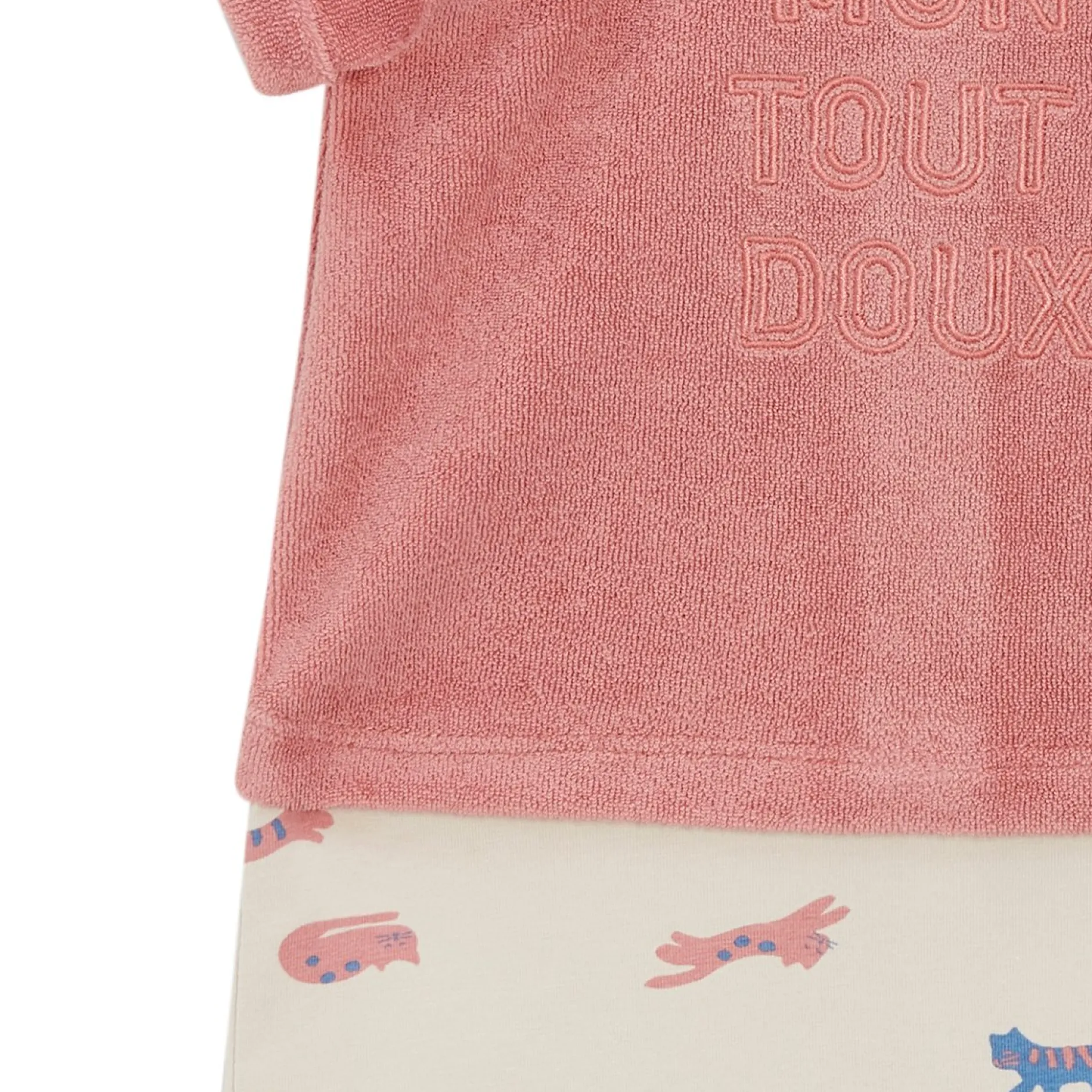 Combicourte Marèse en trompe l’œil : façon tee shirt sur short. Elle est en jersey de Coton sur fond beige avec imprimé « petits chats » bleu saphir et terracotta sur le Bas et en éponge unie en terracotta sur le Haut. Entièrement ouverte dans le dos par des pressions et le Bas est ouvert entrejambes pour faciliter le change de bébé. Le Haut façon tee shirt est brodé avec le texte : » Mon tout doux » avec des oreilles de chat en volume qui donnent un côté ludique. La pièce confortable que l’on peut porter toute la journée à avoir dans son petit dressing ! Lavage à 30°C.