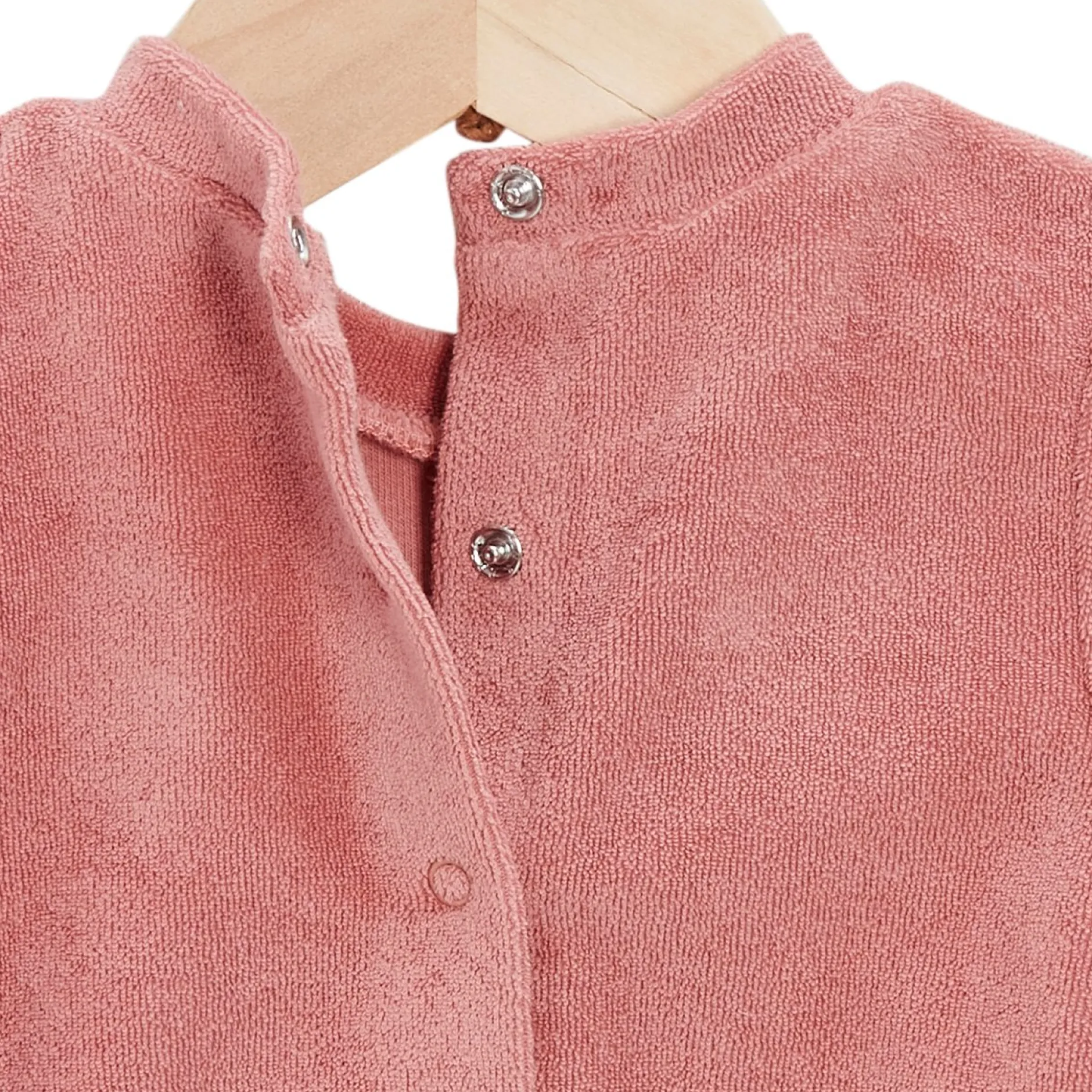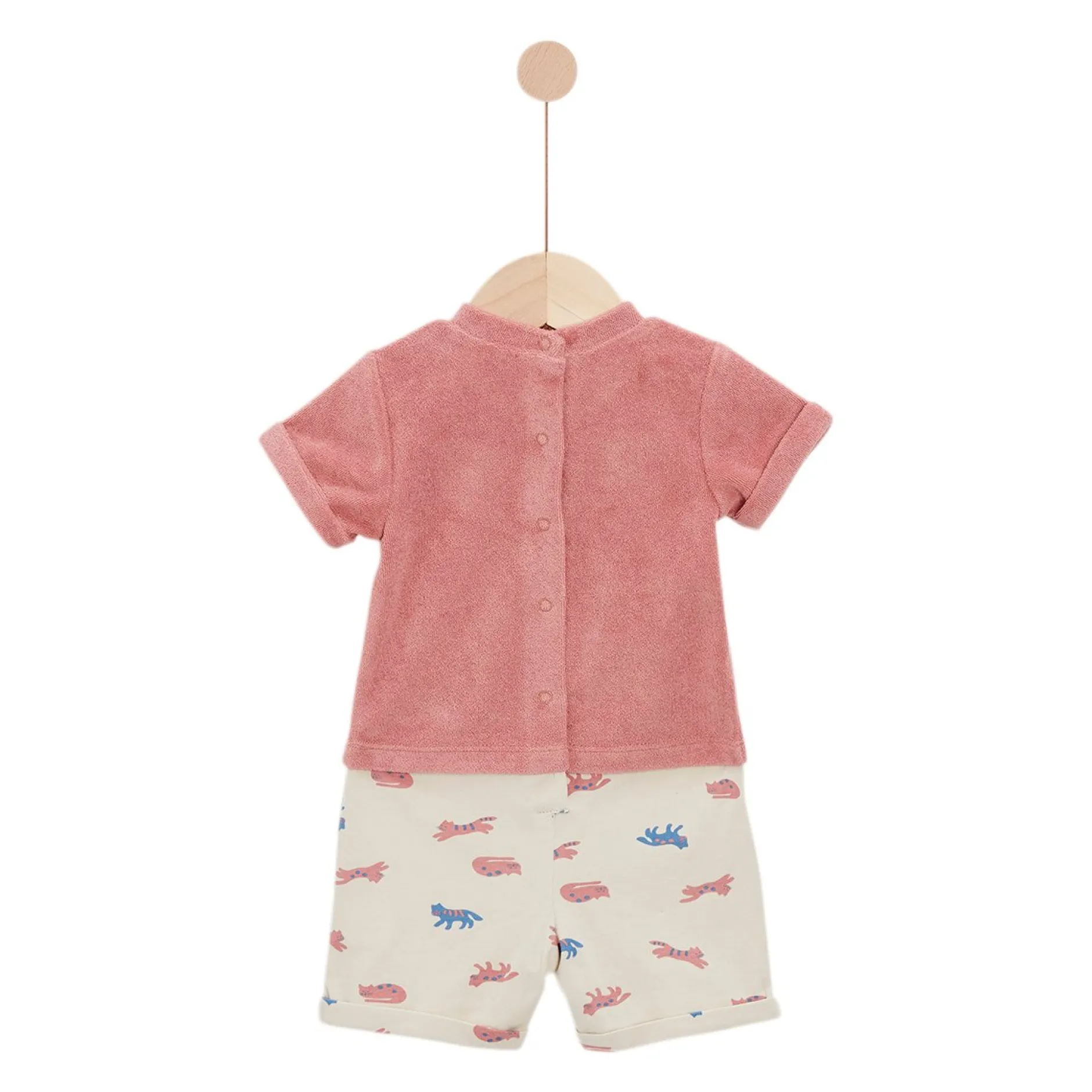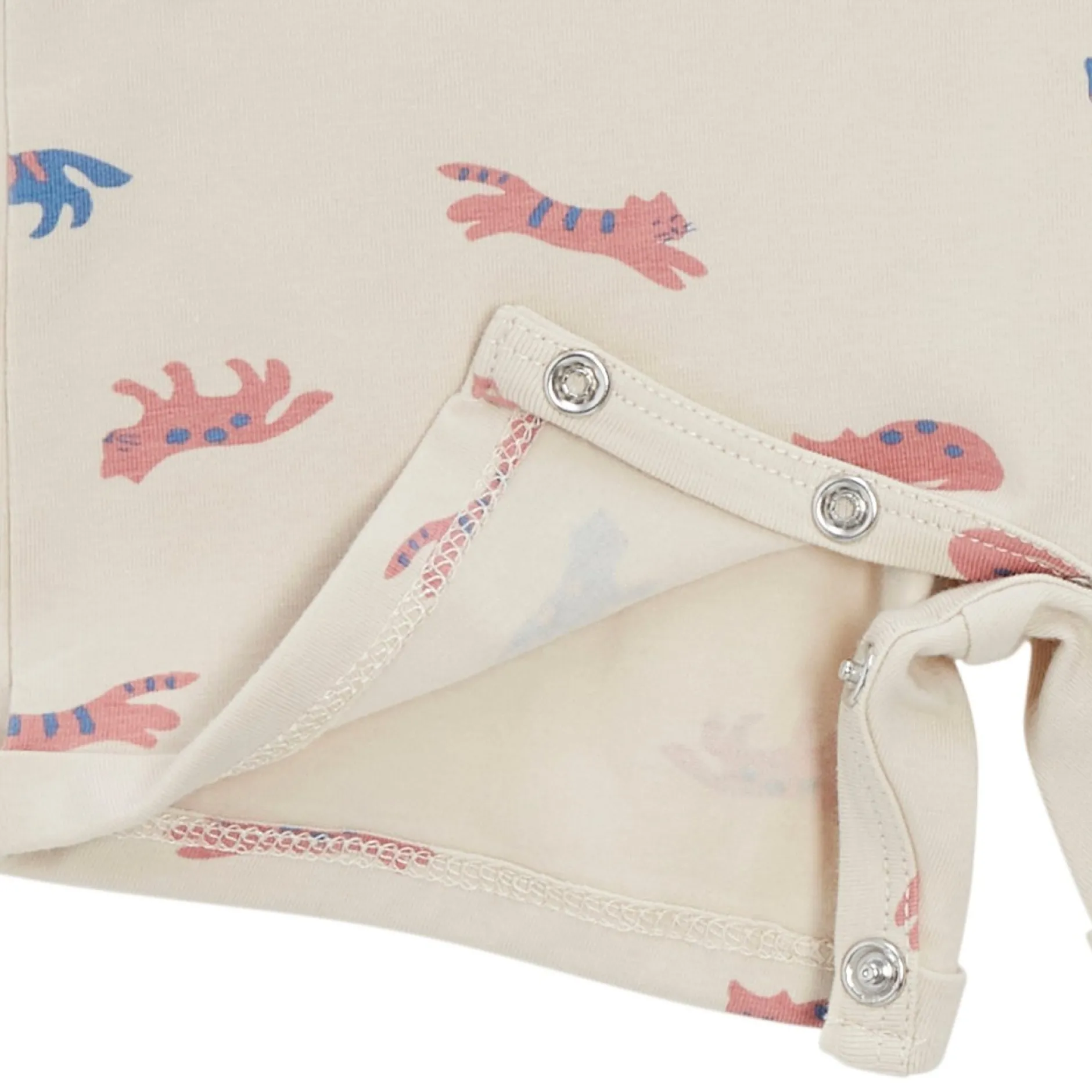 Combicourte Marèse en trompe l’œil : façon tee shirt sur short. Elle est en jersey de Coton sur fond beige avec imprimé « petits chats » bleu saphir et terracotta sur le Bas et en éponge unie en terracotta sur le Haut. Entièrement ouverte dans le dos par des pressions et le Bas est ouvert entrejambes pour faciliter le change de bébé. Le Haut façon tee shirt est brodé avec le texte : » Mon tout doux » avec des oreilles de chat en volume qui donnent un côté ludique. La pièce confortable que l’on peut porter toute la journée à avoir dans son petit dressing ! Lavage à 30°C.