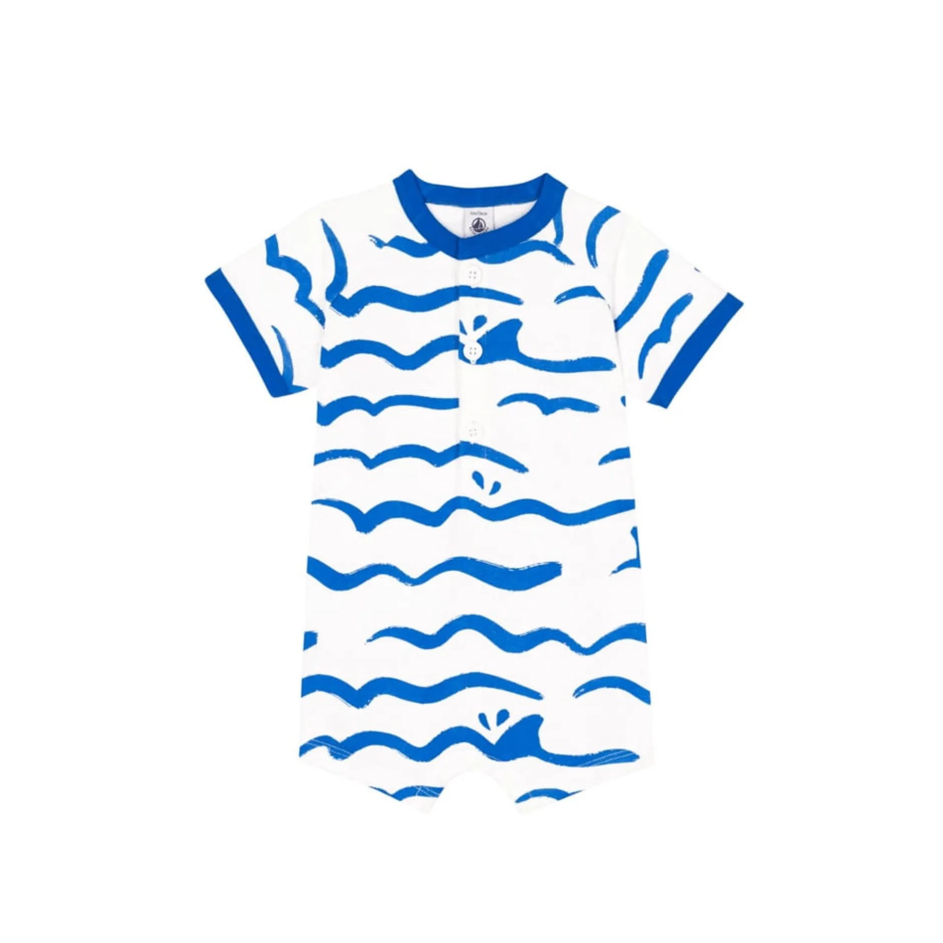 Combinaison courte garçon en molleton, une matière confortable, au col et manches contrastés. On craque pour cet imprimé qui sent bon les vacances et nous donne des envies de plage !