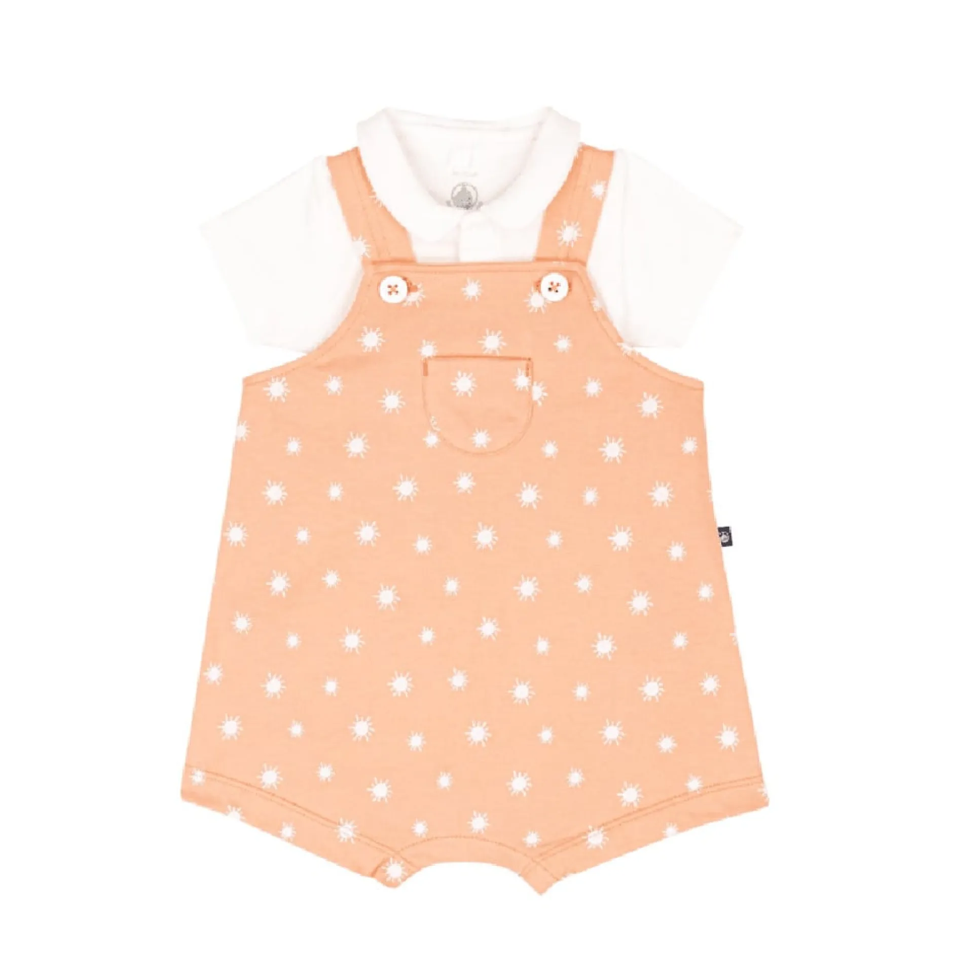 Salopette avec un joli imprimé soleil et une poche plaquée devant.