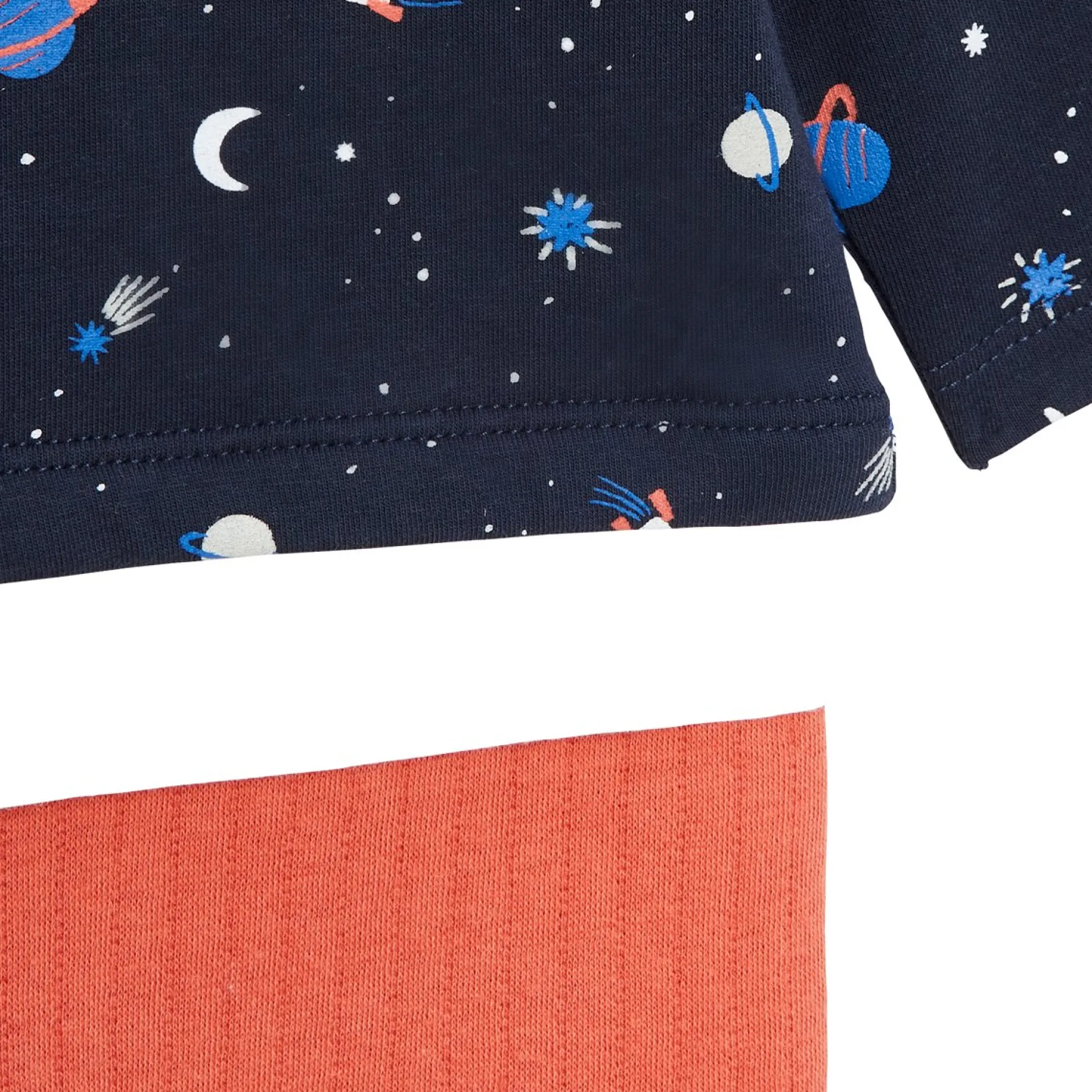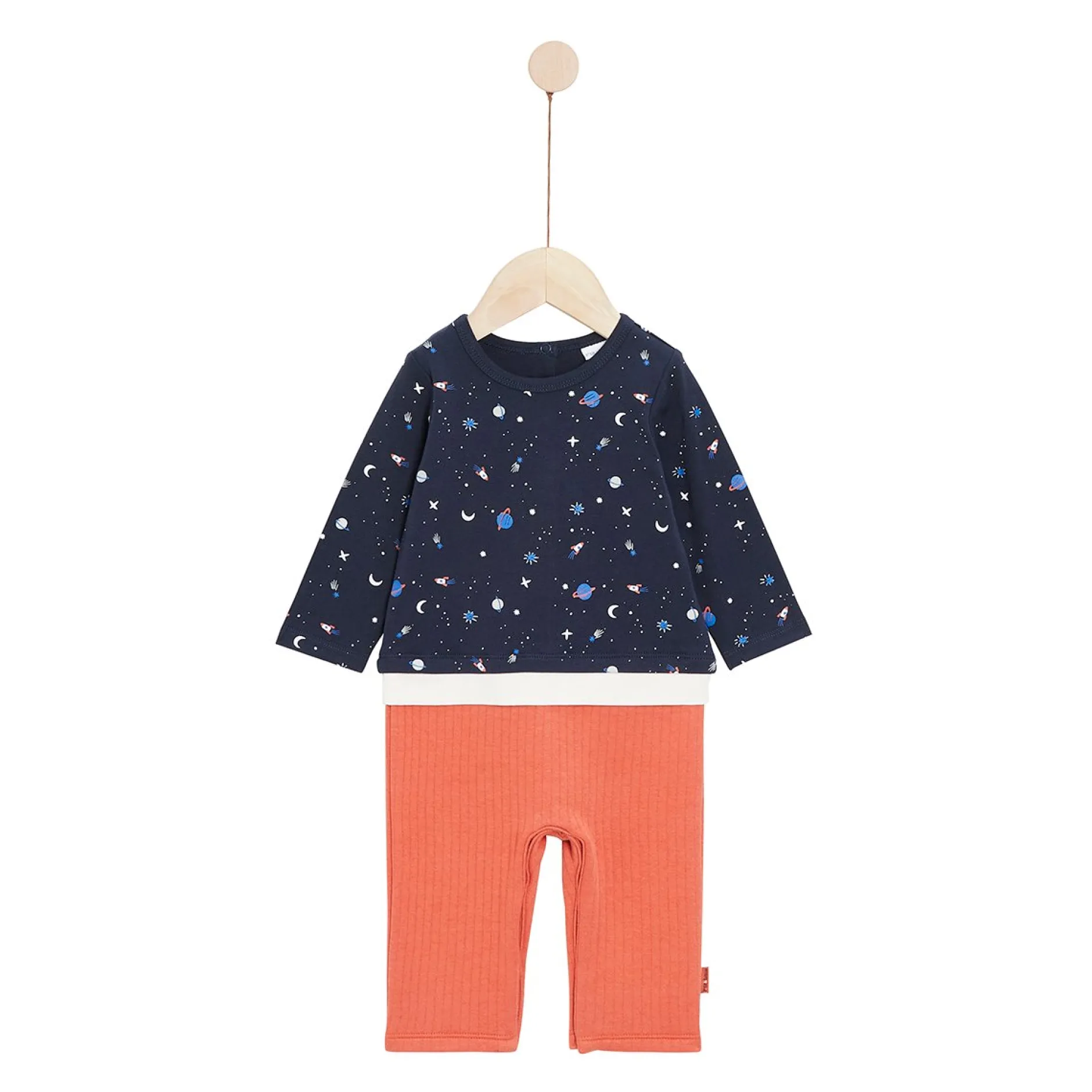Combilongue P’tit Bisou avec le haut et le bas attenants : le haut manches longues est en jersey lycra marine avec un imprimé très tendance : la constellation avec des fusées, des étoiles, un lune et des planètes. Et le bas est en molleton jacquard en orange paprika.